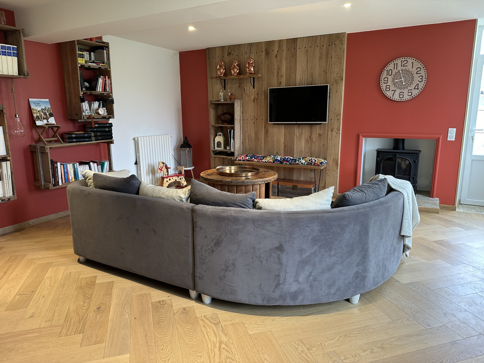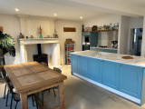 Elle se compose d'une belle entrée sur carreaux de ciment. Grand salon de 30m2 avec poêle et parquet en chêne massif. Salle à manger de 27m2 extremement lumineux. L'ilot central et les équipements modernes mariés avec la cheminée massive font de la cuisine une réelle pièce de vie avec une superficie de 27m2 et un confort assez rare apporté par un traitement des murs en chaux/chanvre. Le rez de chaussée se compose également d'une grande buanderie/bureau de 27m2 ainsi qu'une cave et accés direct au garage.