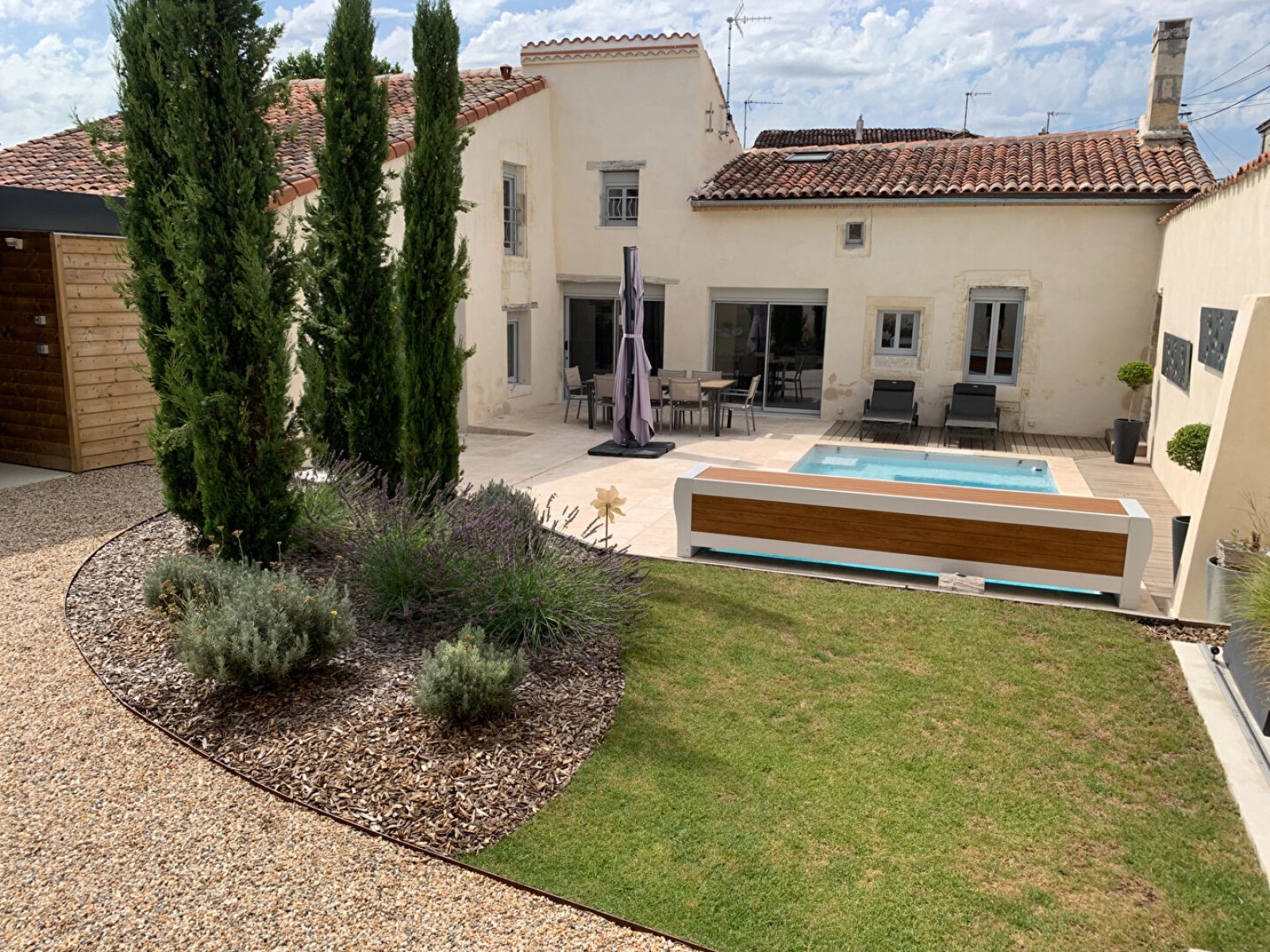 Sandra vous présente en exclusivité cette petite pépite nichée au coeur du quartier Saint Martin dans une rue très calme (proche écoles et commerces) Cette superbe maison entièrement rénovée en 2021 se compose d'une belle entrée sur pierre de Charente avec chaufferie et WC. Grande cuisine ouverte équipée de tout l'électroménager ainsi qu'une cave a vin. Magnifique séjour salon avec cheminée du XVIIème (murs en chaux chanvre) ouvert sur la cuisine avec sol en béton millimétrique le tout faisant une surface de 75m2 donnant sur le jardin et la piscine. Vous trouverez également en rez de chaussée une superbe suite parentale (salle d'eau WC et grand dressing) L'étage se compose d'une mezzanine ouverte sur le salon, bureau, 3 chambres , salle d'eau et WC. Murs et toitures isolés en laine de roche. Double vitrage alu et pvc. Chaudière Atlantic (domotique) Piscine au sel 6/3 équipée d'une pompe a chaleur, carport, atelier, portail électrique. A voir absolument (curieux s'abstenir) Me contacter 0683405316.