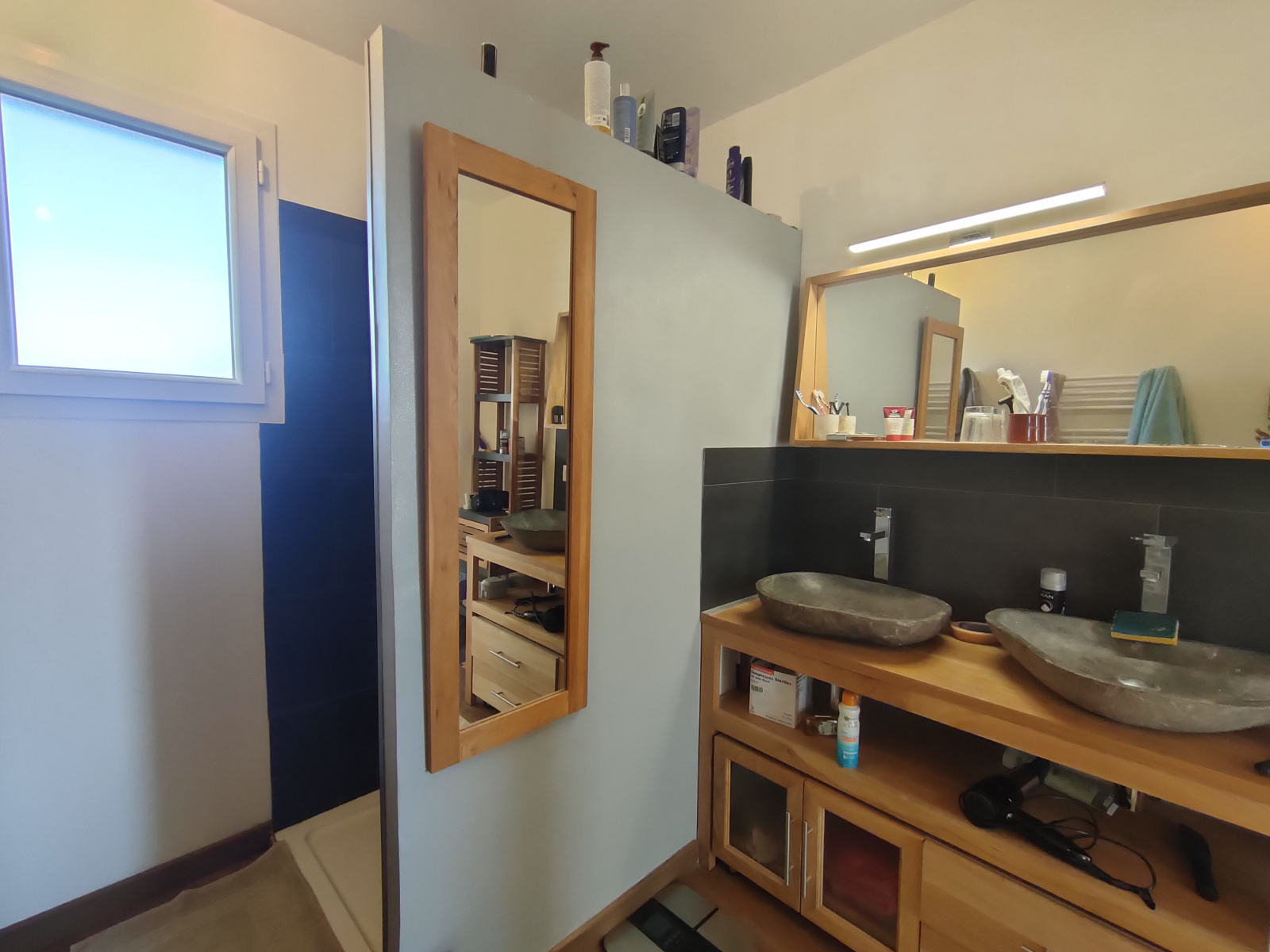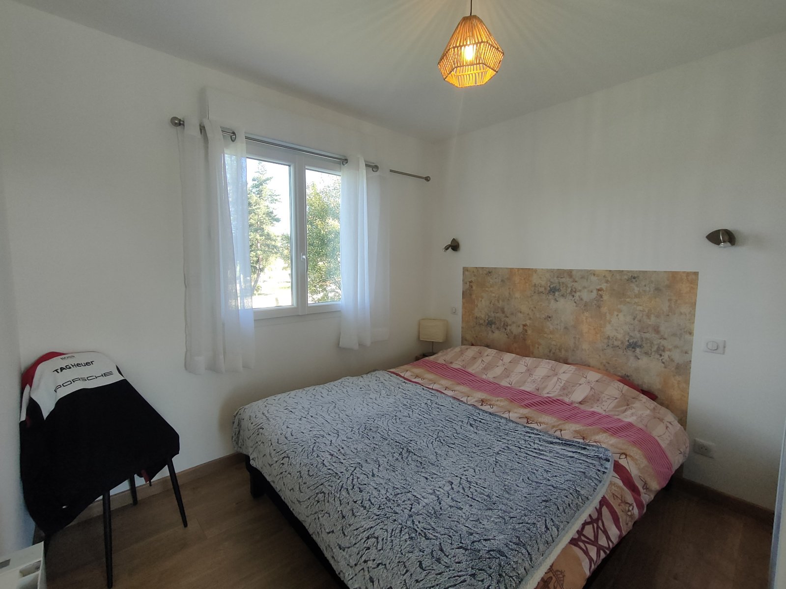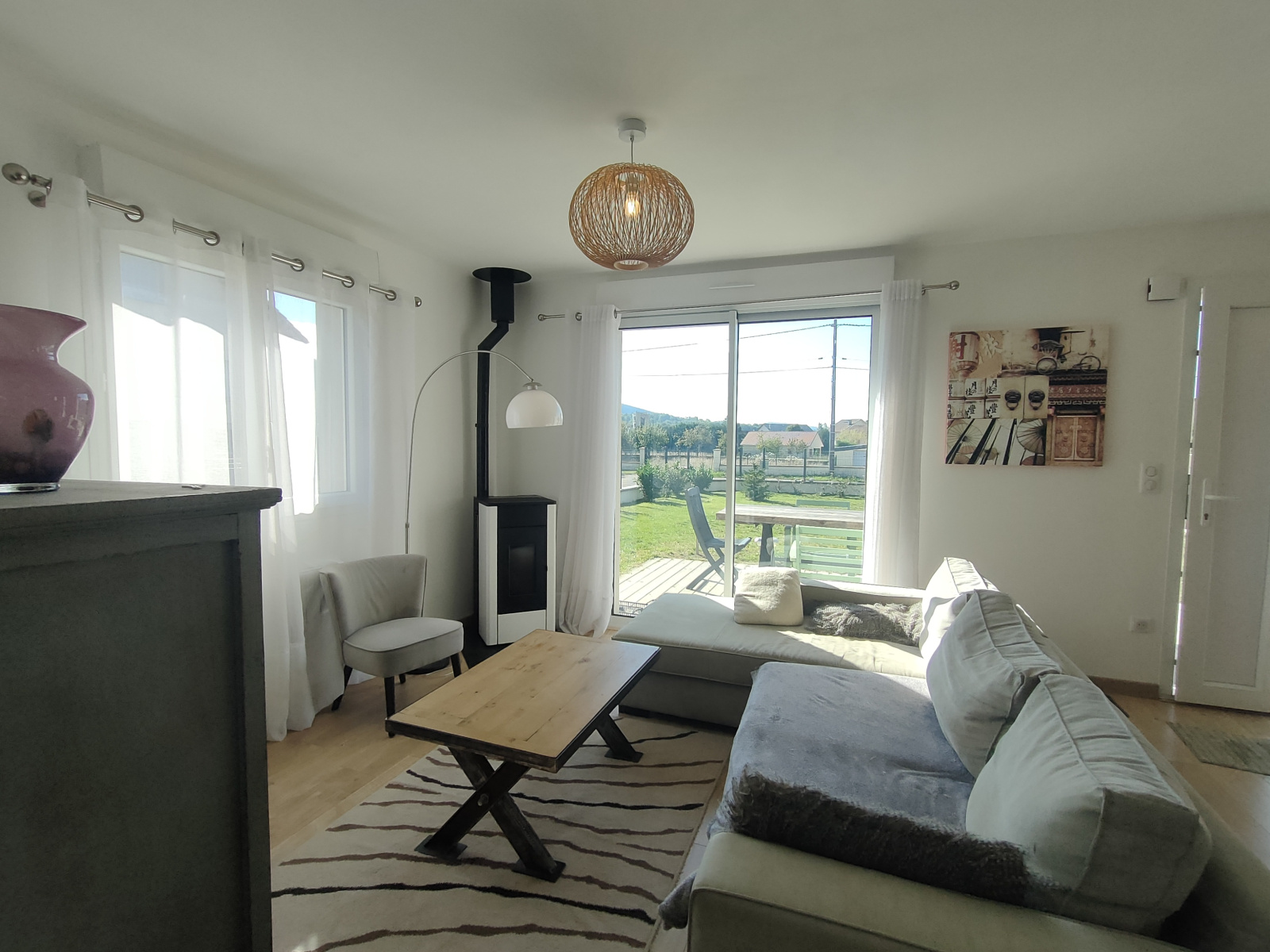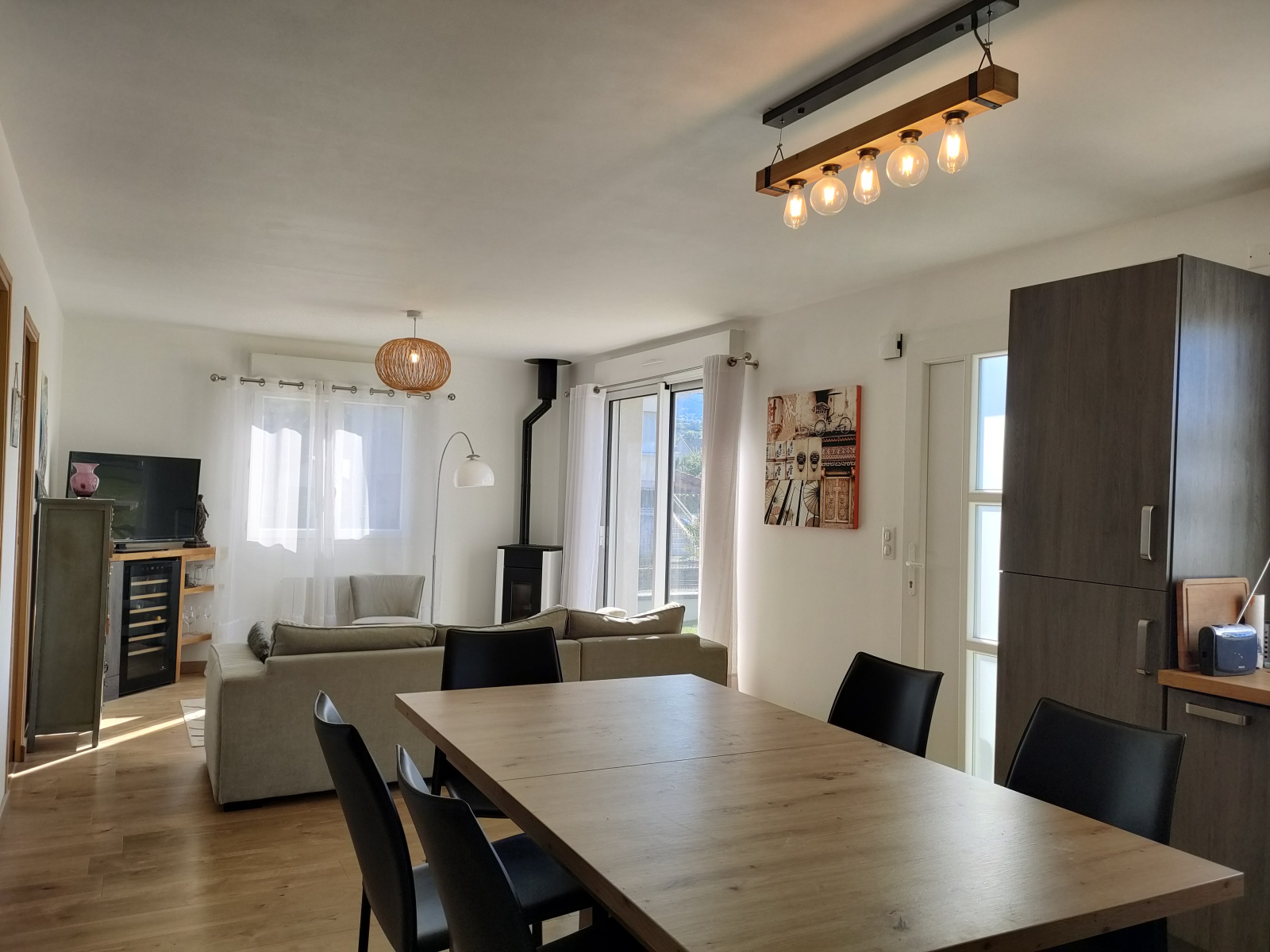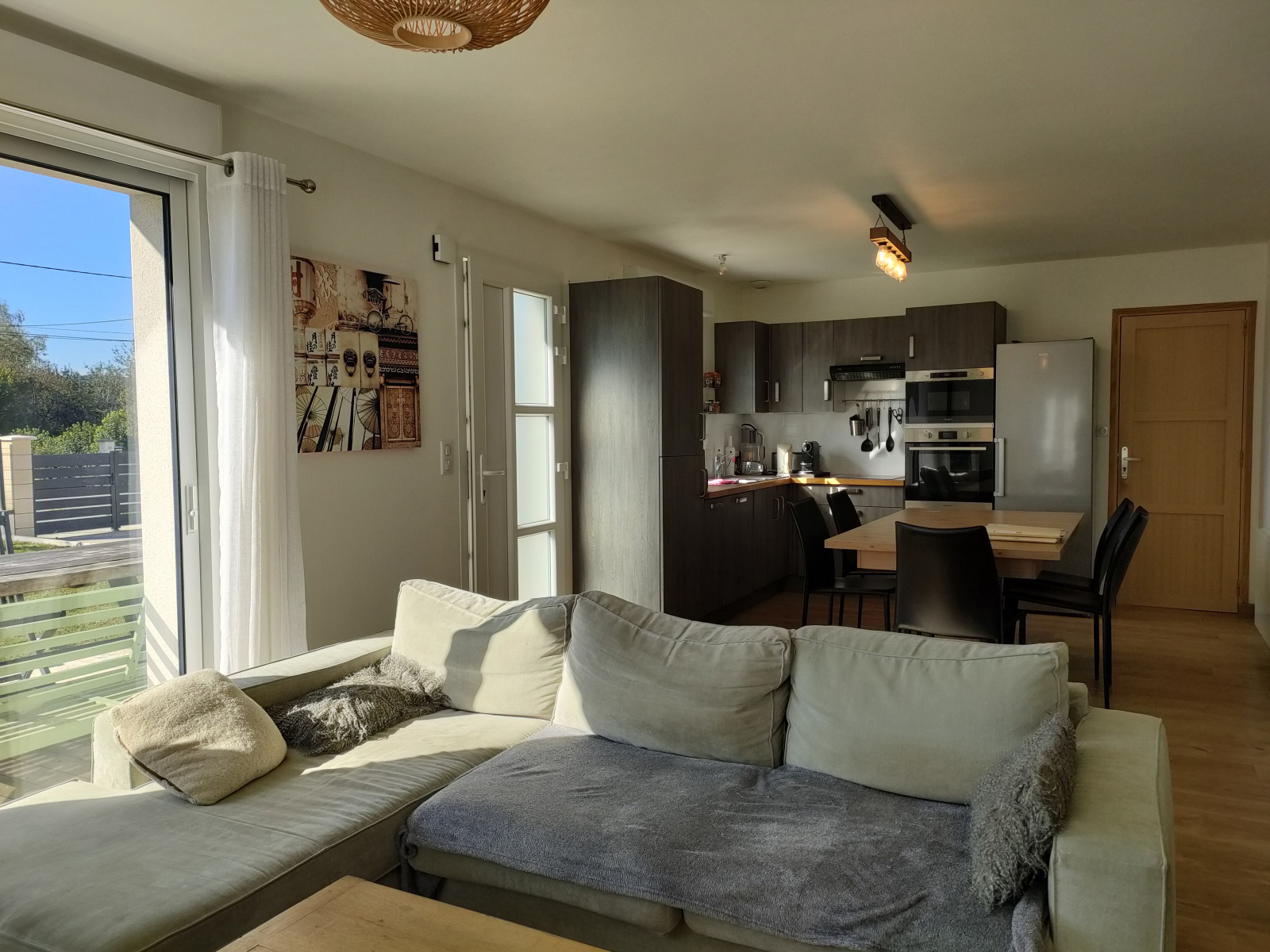 - la maison principale avec cuisine ouverte sur le séjour (donnant sur une terrasse), 2 chambres, une salle de bain avec WC. Grand garage avec espace pouvant être aménagé en salle de sport, atelier, chambre supplémentaire. Ce qui va vous faire craquer : le poele à granulés dans le salon, l'aspect ultra fonctionnel et économique de la maison, sa luminosité.