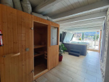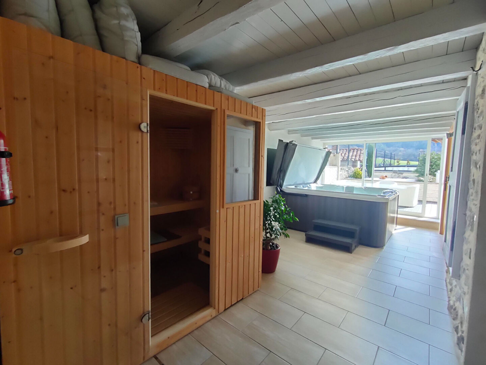 - au rez de chaussée : entrée, grand séjour avec cheminée, cuisine équipée donnant sur la terrasse, chambre avec salle de bain/WC, WC, espace détente avec sauna et jacuzzi.