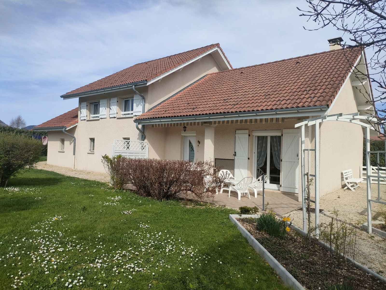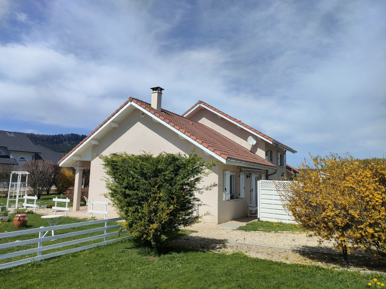 Dans le village de Brenod, dans un quartier calme avec peu de vis à vis, belle maison entretenue de 90m2 avec garage double, le tout batie sur une parcelle plate et arborée de 1179m2.