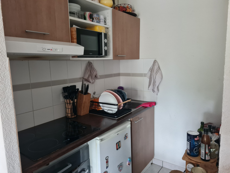 Séjour avec coin cuisine, chambre avec placard, salle de bains, Wc séparé -
