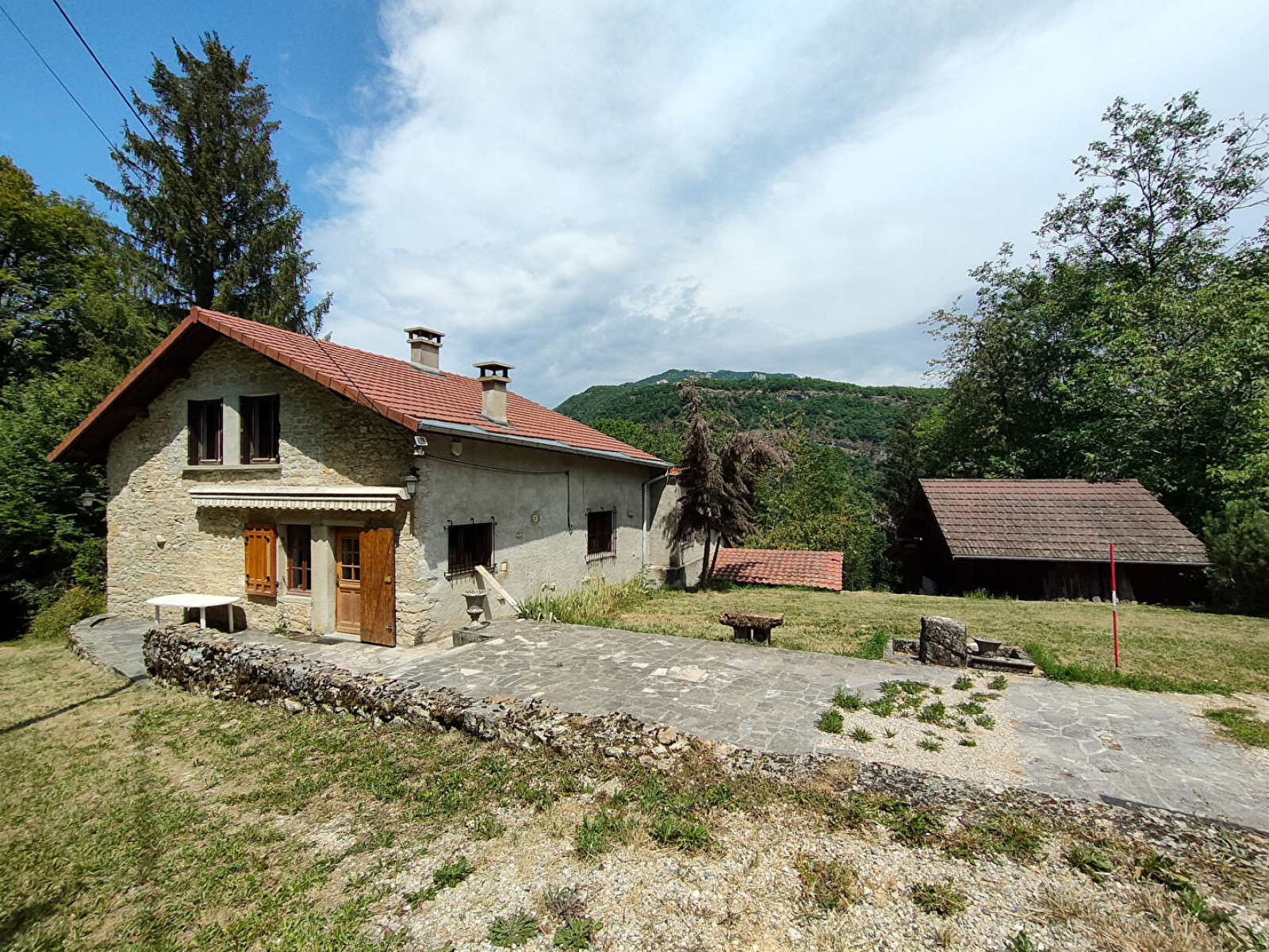*SOUS COMPROMIS* EN EXCLUSIVITE Envie de calme et de grands espaces ? Rencontrons nous lors de la visite de cette charmante maison en pierre nichée au dessus de la vallée de l'Albarine. Maison en pierre de 130m2 habitables environ, avec potentiel d'agrandissement dans des parties attenantes. Idéale pour les bricoleurs et jardiniers : 2 grandes garages et une cave sauront vous satisfaire (avec raccordement électrique en 380V). Le bonus : maison vendue avec parcelles de prés et de forêt pour un total de plus de 3 hectares (2.4 hectares attenant à la maison) La maison est au bout d'une impasse, elle comprend: Au rdc : cuisine, salon avec cheminée, une chambre, salle d'eau, WC. A l'étage : un espace sous combles avec ouvertures déjà existantes de 72m2 au sol. Chambre dortoir pour accueillir famille et amis, lieu d'atelier, salle de jeux.... à vous de choisir ! Chauffage central au gaz (chaudière de 2017). Toiture changée en 2015. N'attendez plus !