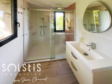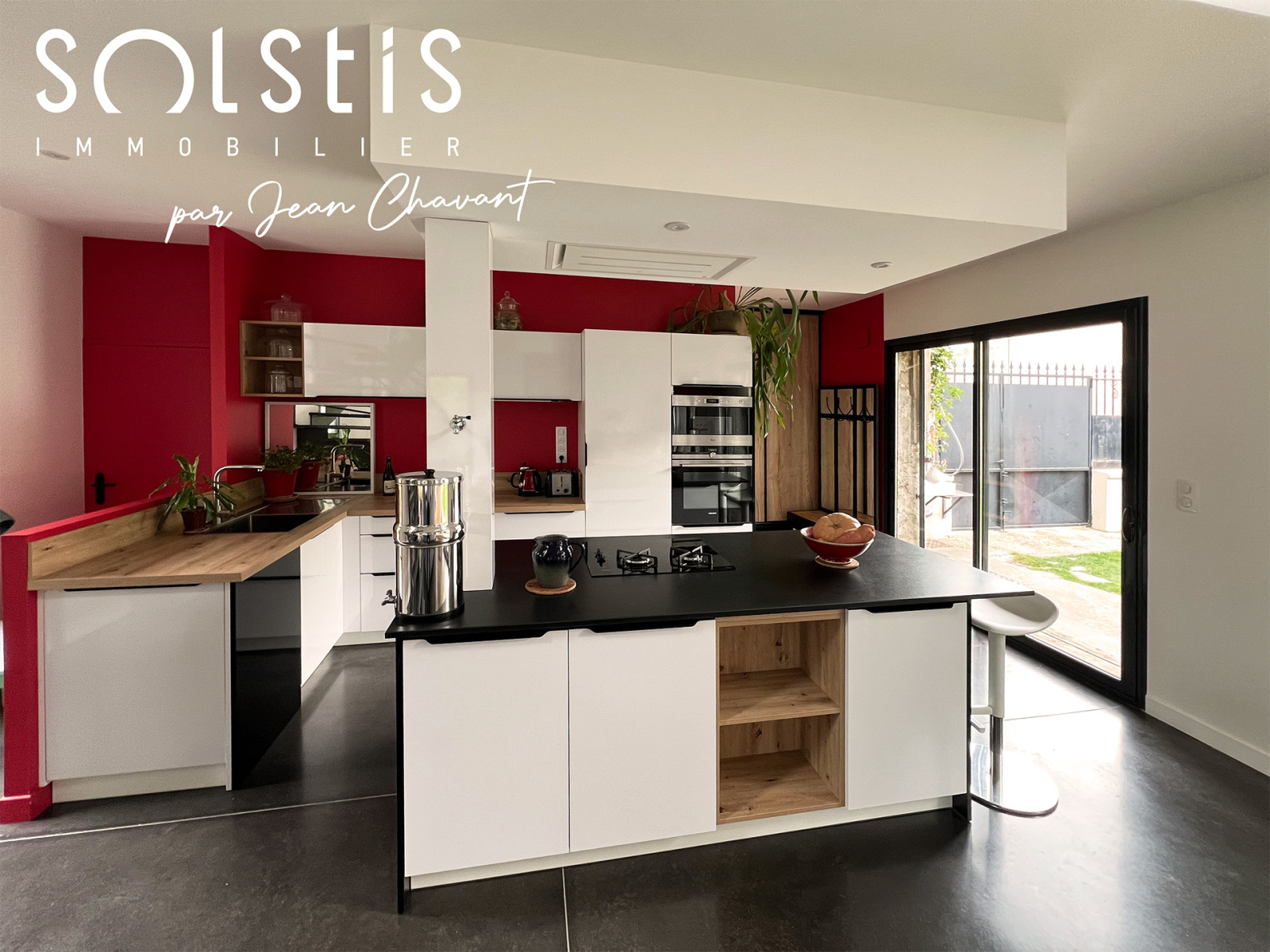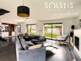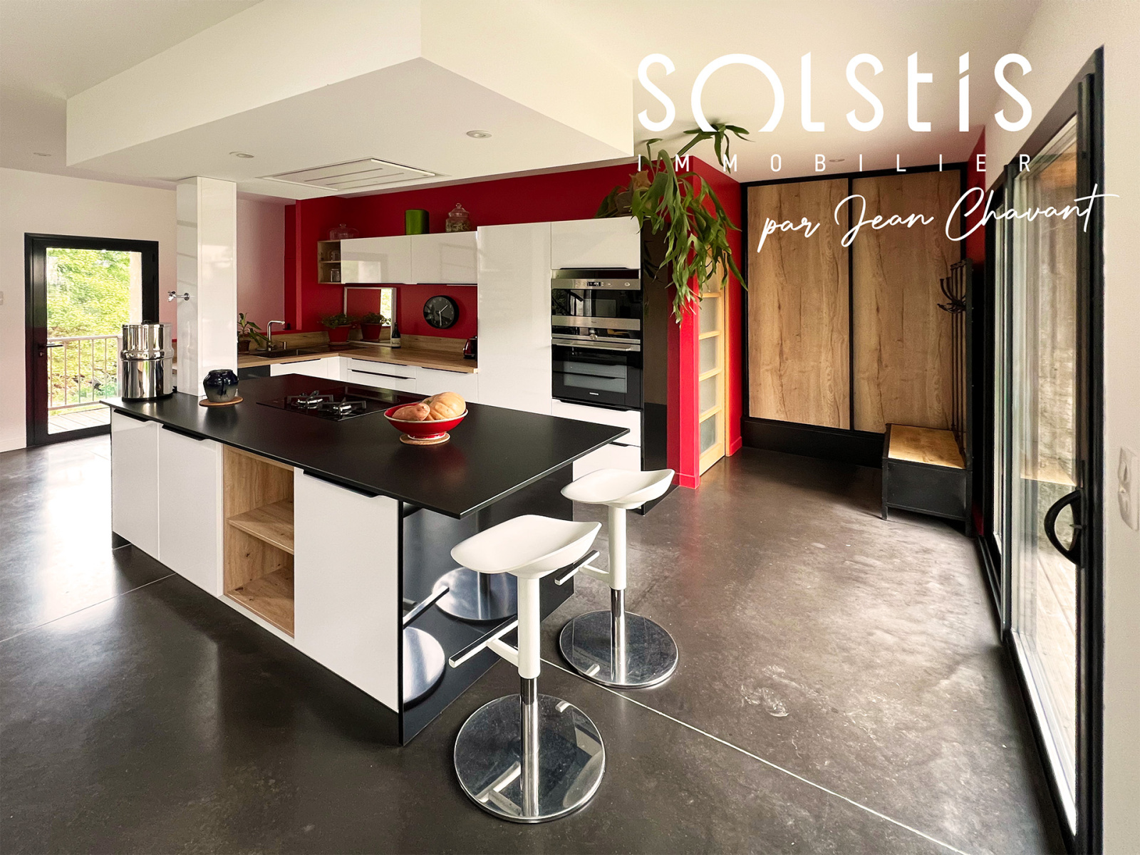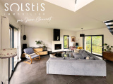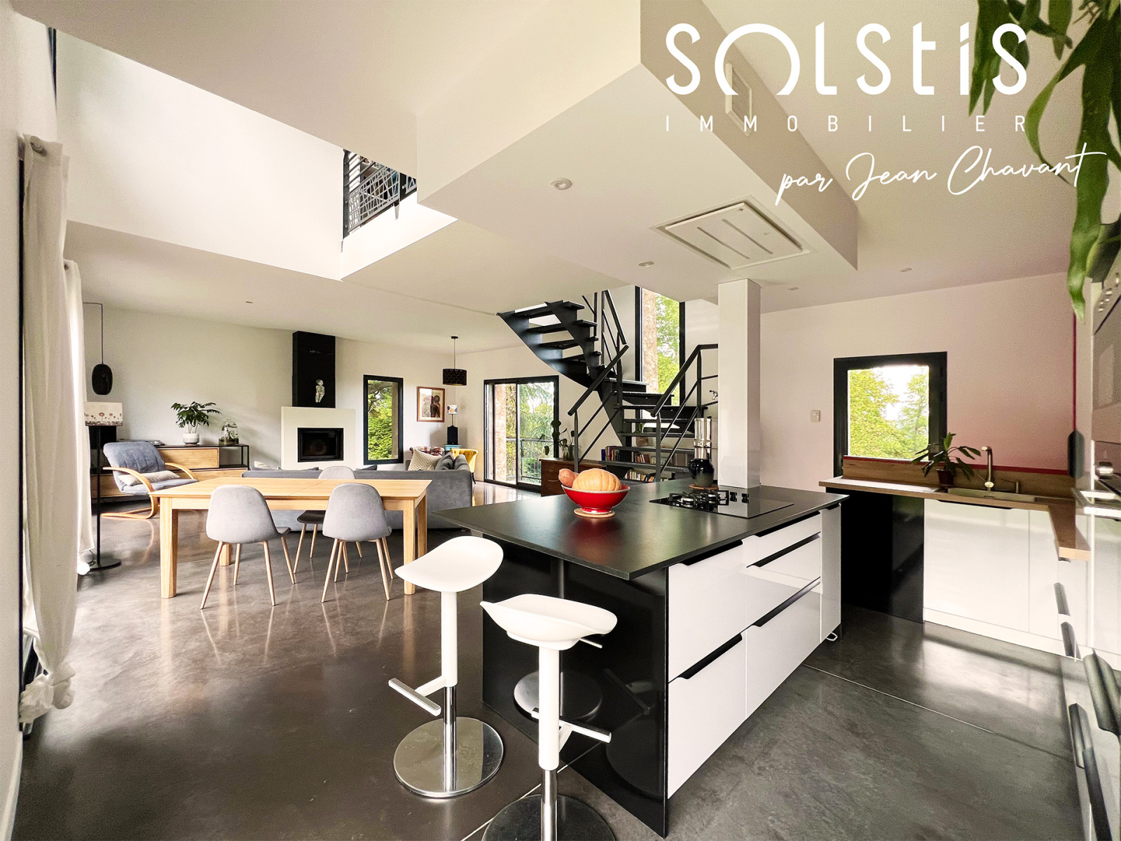 Implantée sur un terrain arboré de 1 208 m², elle séduit par son ambiance loft, ses matériaux nobles et son cachet unique : béton ciré, huisseries sur mesure arrondies, cuisine haut de gamme avec plan de travail en granit et finitions soignées.