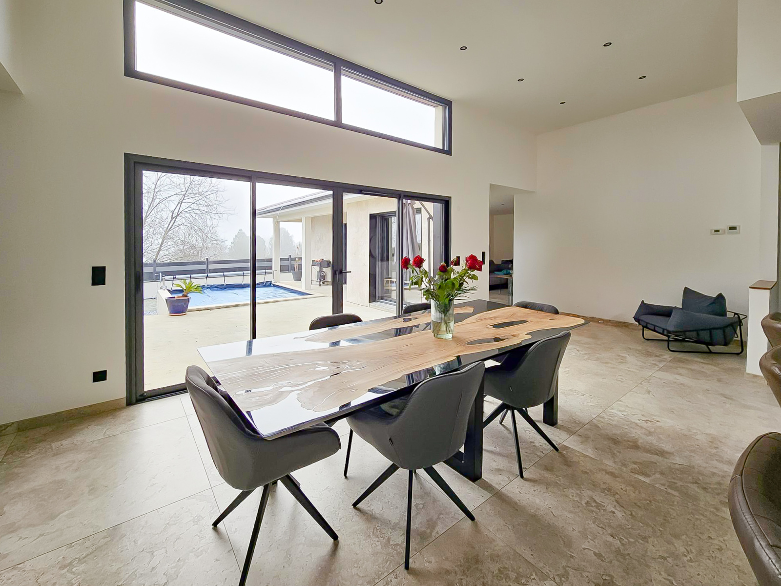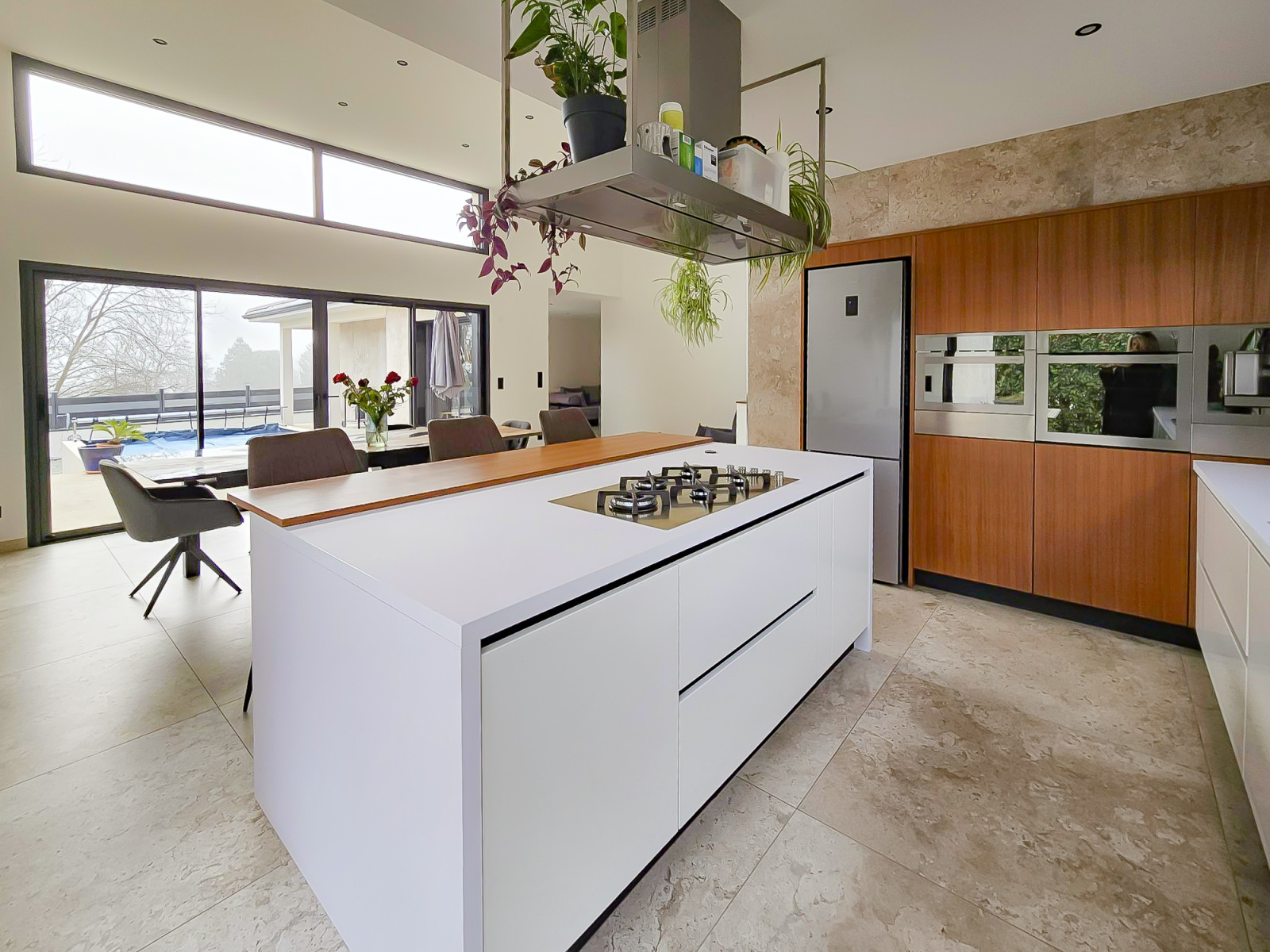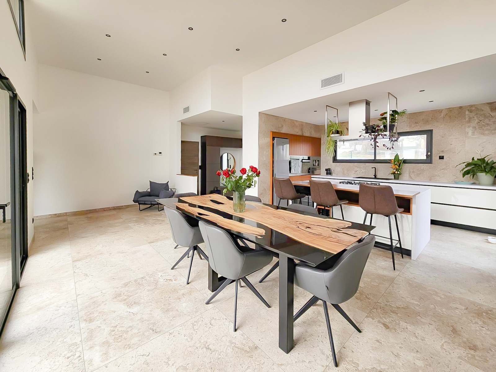 Une grande pièce à vivre en L de 75 m2 avec cuisine haut de gamme entièrement équipée, salle à manger avec grande baie vitrée s'ouvrant sur une terrasse spacieuse avec vue sur la piscine, un espace salon avec meuble télé suspendu et un espace coin lecture ou bureau ..