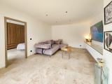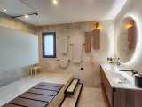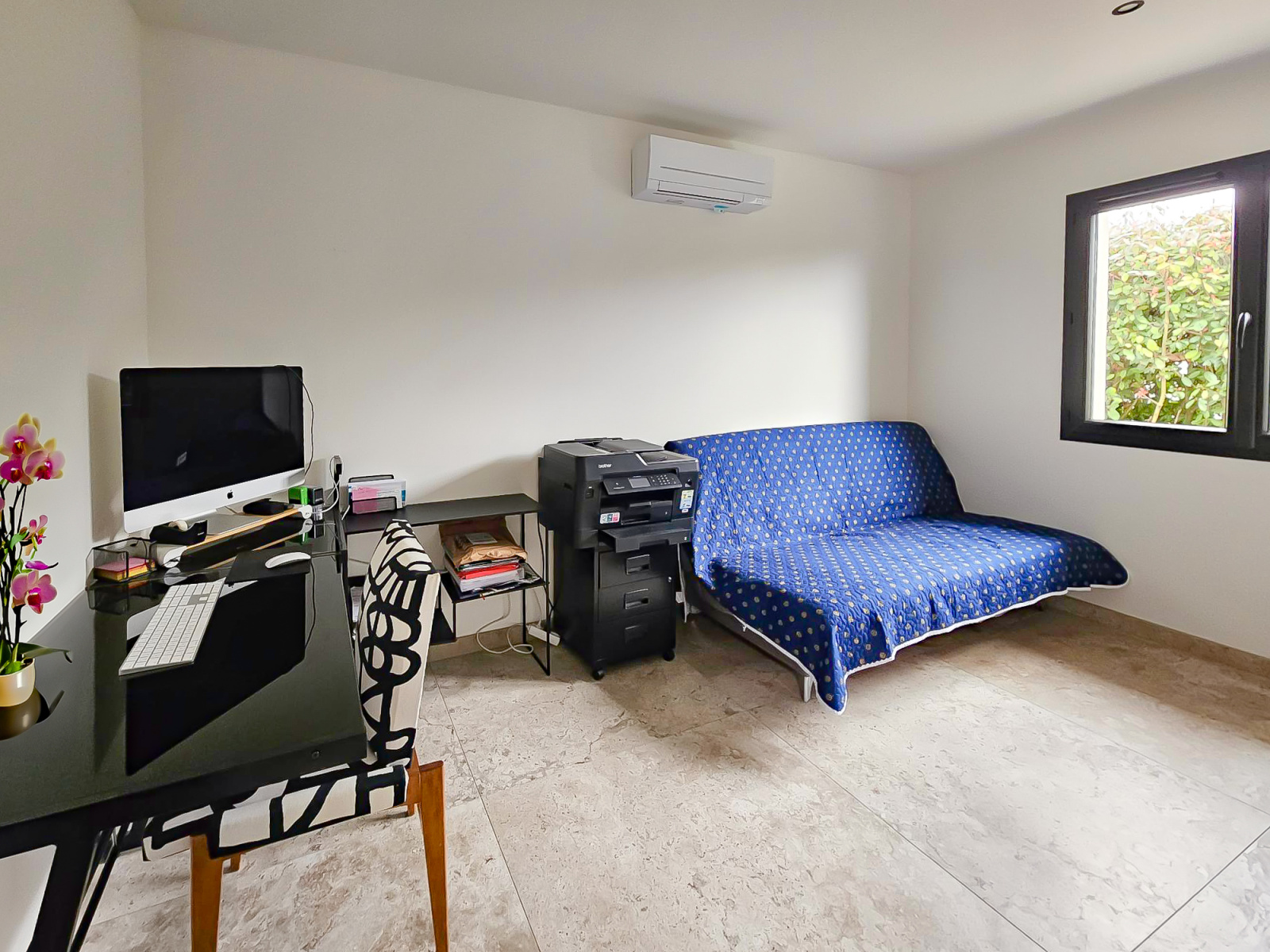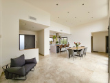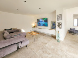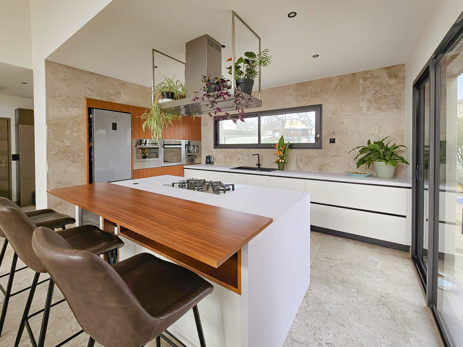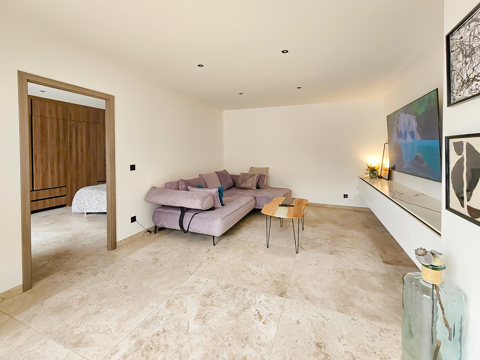 Une grande pièce à vivre en L de 75 m2 avec cuisine haut de gamme entièrement équipée, salle à manger avec grande baie vitrée s'ouvrant sur une terrasse spacieuse avec vue sur la piscine, un espace salon avec meuble télé suspendu et un espace coin lecture ou bureau ..