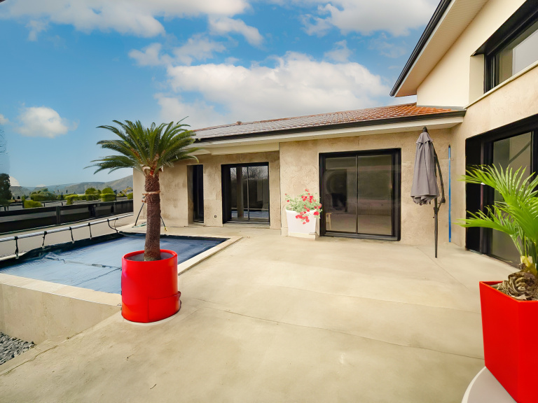 SOUS COMPROMIS - EN EXCLUSIVITE - Maison récente contemporaine de 140 m2 plain pied, pleine de charme sur un terrain paysagé de 754m2 située dans un quartier résidentiel et trés recherché, agrémenté d'un garage carrelé et isolé de 24m2 à 8kms du centre de Vienne et à 6mnn de la gare de St Clair avec parking gratuit.