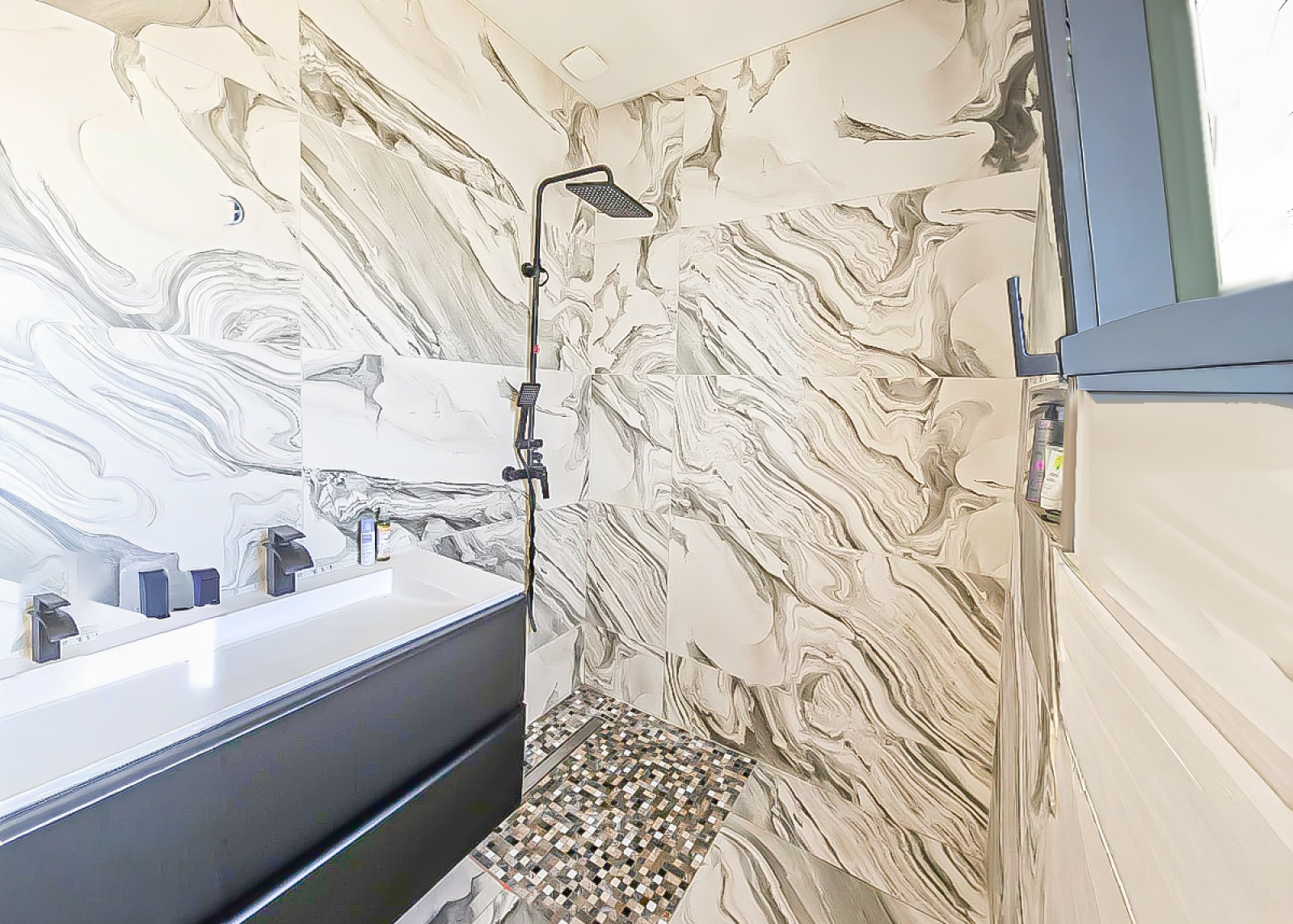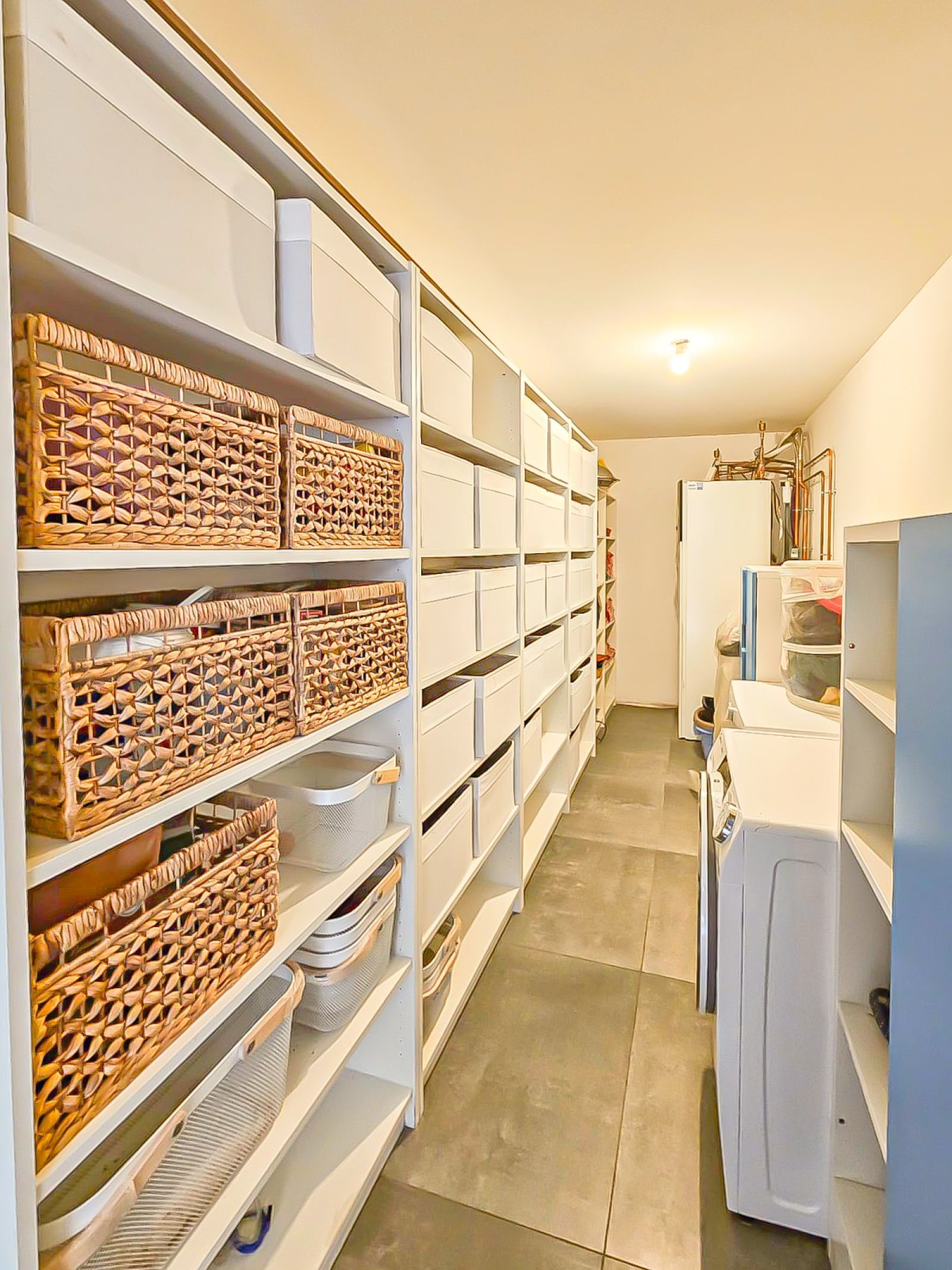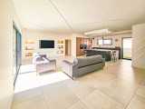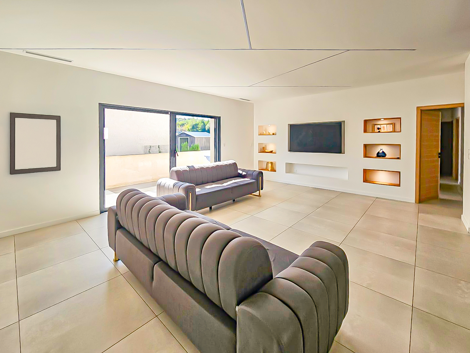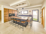 Une grande pièce à vivre de 57m2 lumineuse avec une belle hauteur de plafond de 2M70, grande baie vitrée à galandage et agrémentée d'une cuisine américaine entièrement équipée, avec une porte donnant sur un cellier de 10m2.