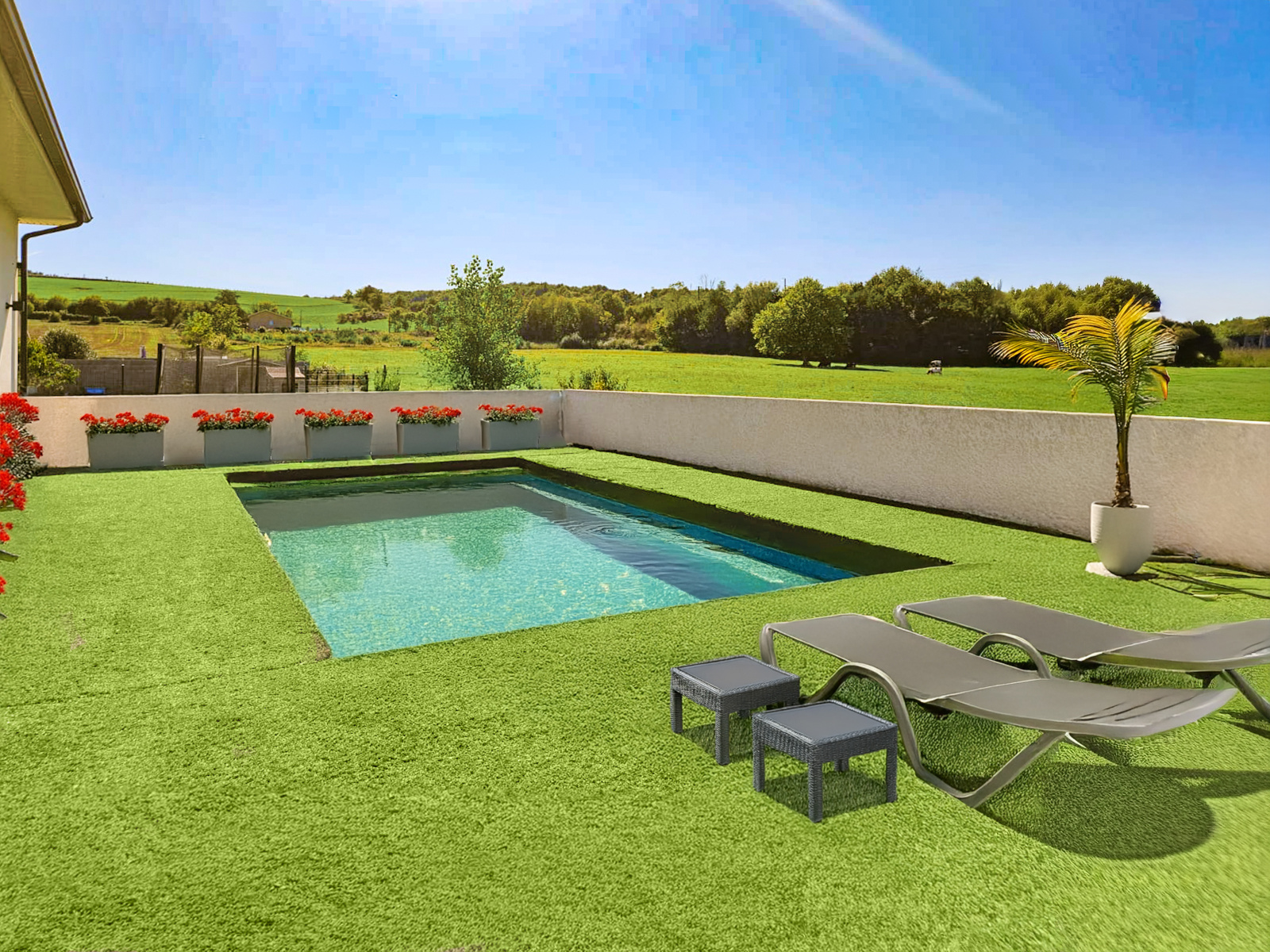 EN EXCLUSIVITE - Maison contemporaine plain pied familiale avec un beau volume de 158m2 sur un terrain de 510m2 agrémenté d'une piscine 4X8m chauffée, située à 4 kms de Eyzin Pinet, 18 mn de Vienne, 20 mn de Bourgoin Jallieu, 45 mn de Lyon centre sur la commune de Meyssiez.