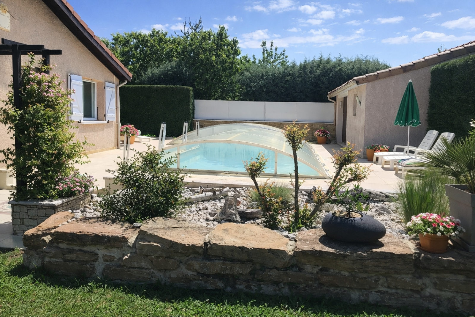 EN EXCLUSIVITE - Maison plain pied de 134m2 avec beaucoup de charme, lumineuse et agréable à vivre, sur un terrain plat arboré et clos de 1087m2, entrée goudronnée, garage de 21m2 + dépendance de 19m2 et local jardin de 5m2, agrémenté d'une piscine couverte avec un dôme (rétractable complètement) de 8X4m électrolyse et de son pool house .