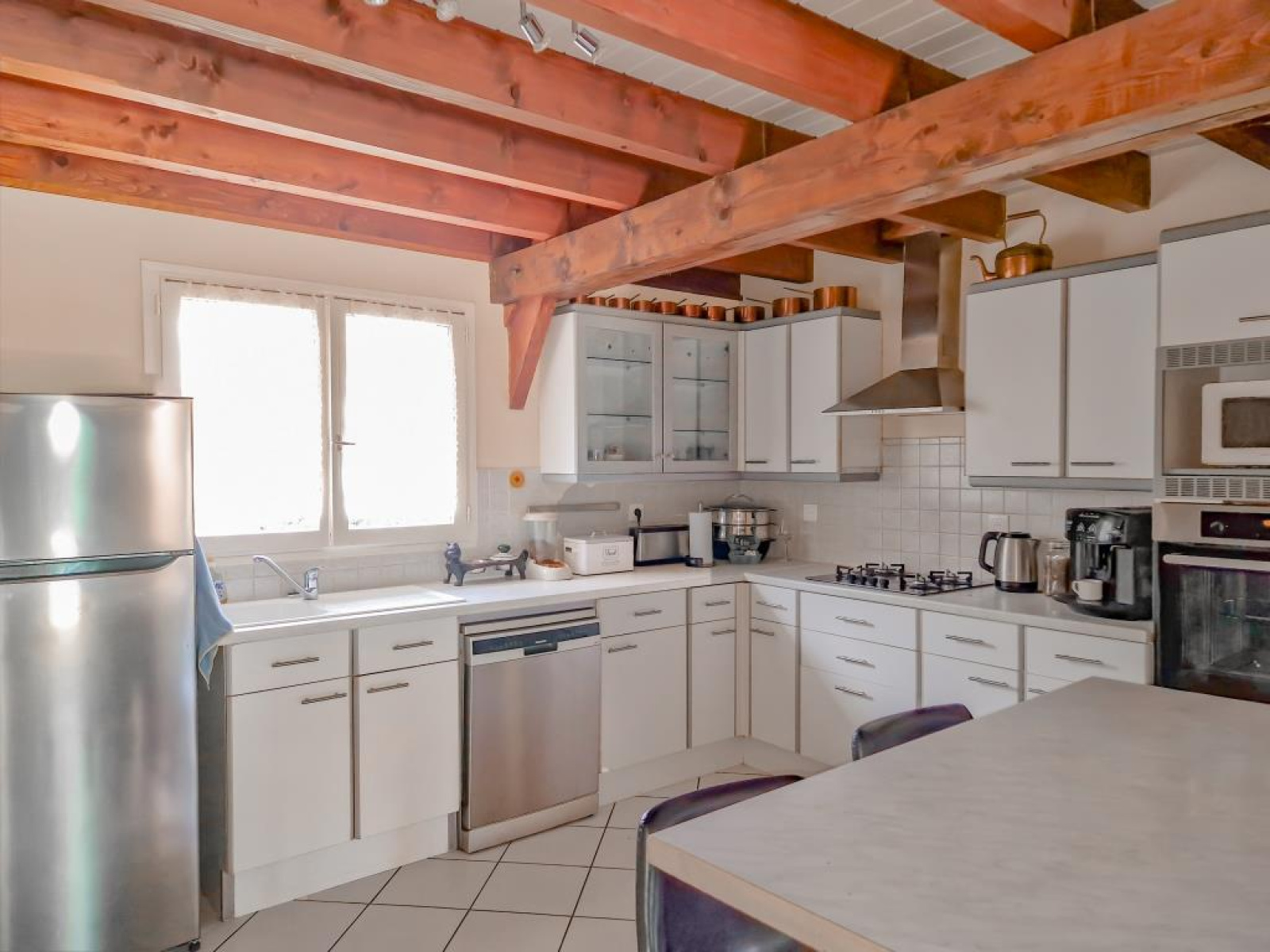 Chauffage au sol infra-câble + convecteurs à l'étage + cheminée avec insert, menuiseries bois double vitrage, tout à l'égout, abris bois + récupération d'eau de pluie.