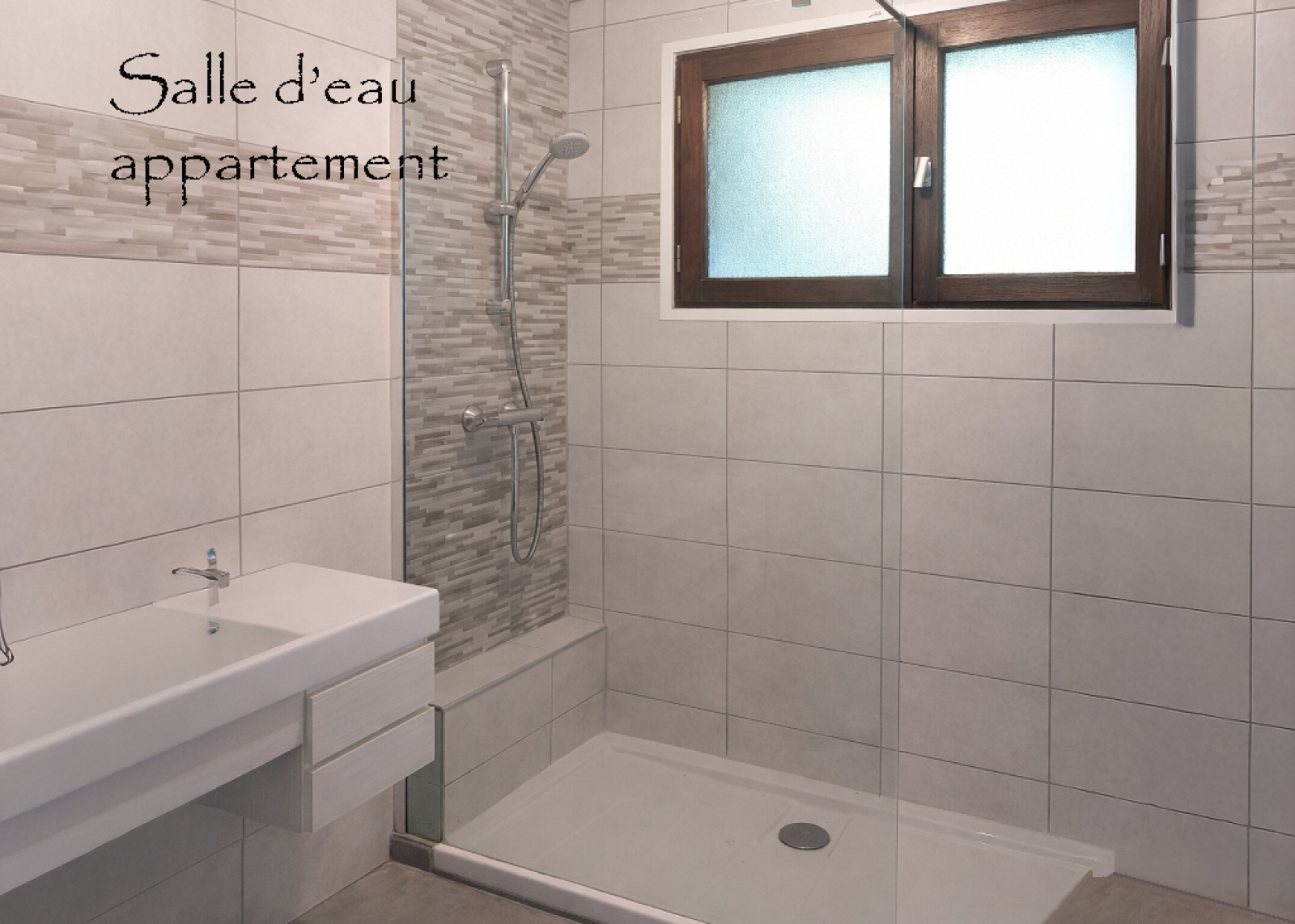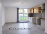 RDC : entrée de la maison, garage (porte actuellement murée, mais facile à remettre dans l'état d'origine), atelier, appartement T3 comprenant une pièce de vie avec cuisine équipée, 2 chambres, une salle d'eau et un wc séparé.