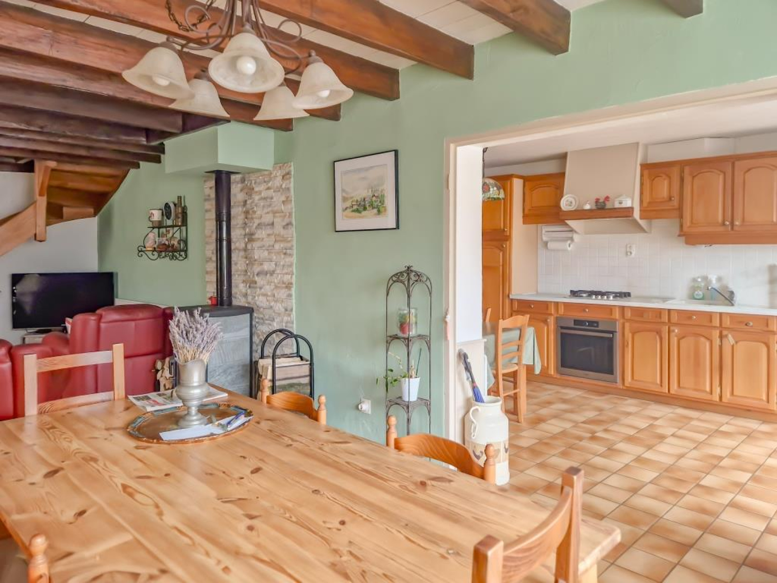Chauffages poêle à bois + convecteurs électriques, isolation par les murs et par le toit, menuiseries pvc double vitrage.
