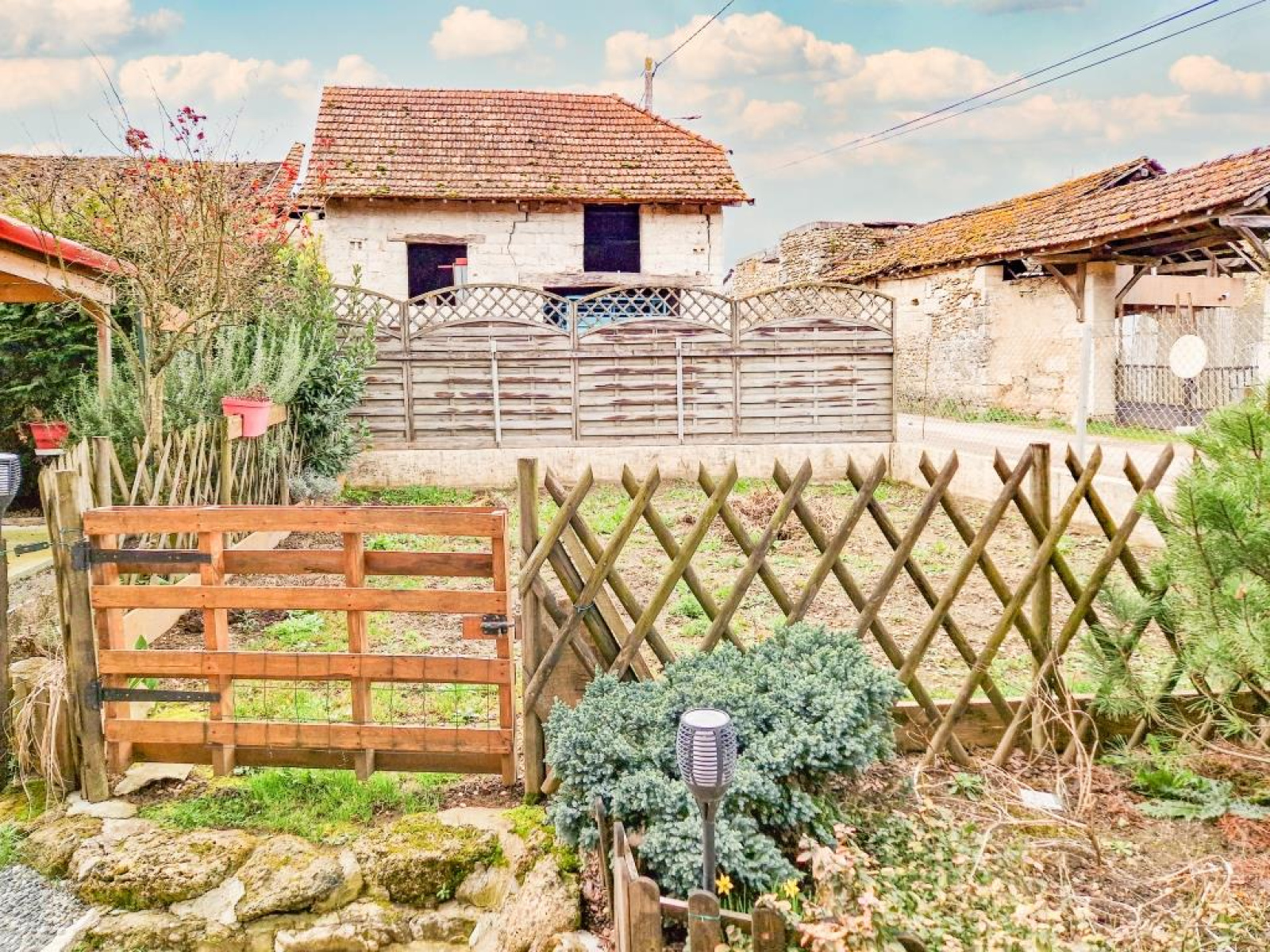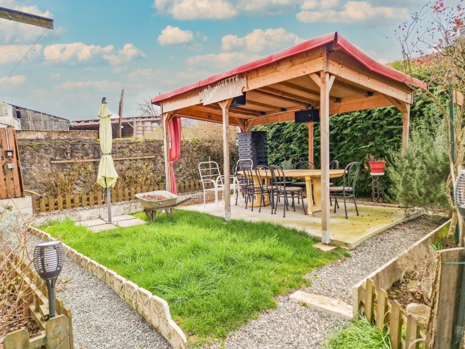 Joli terrain plat avec terrasse, jardin et abri/pergolas.
