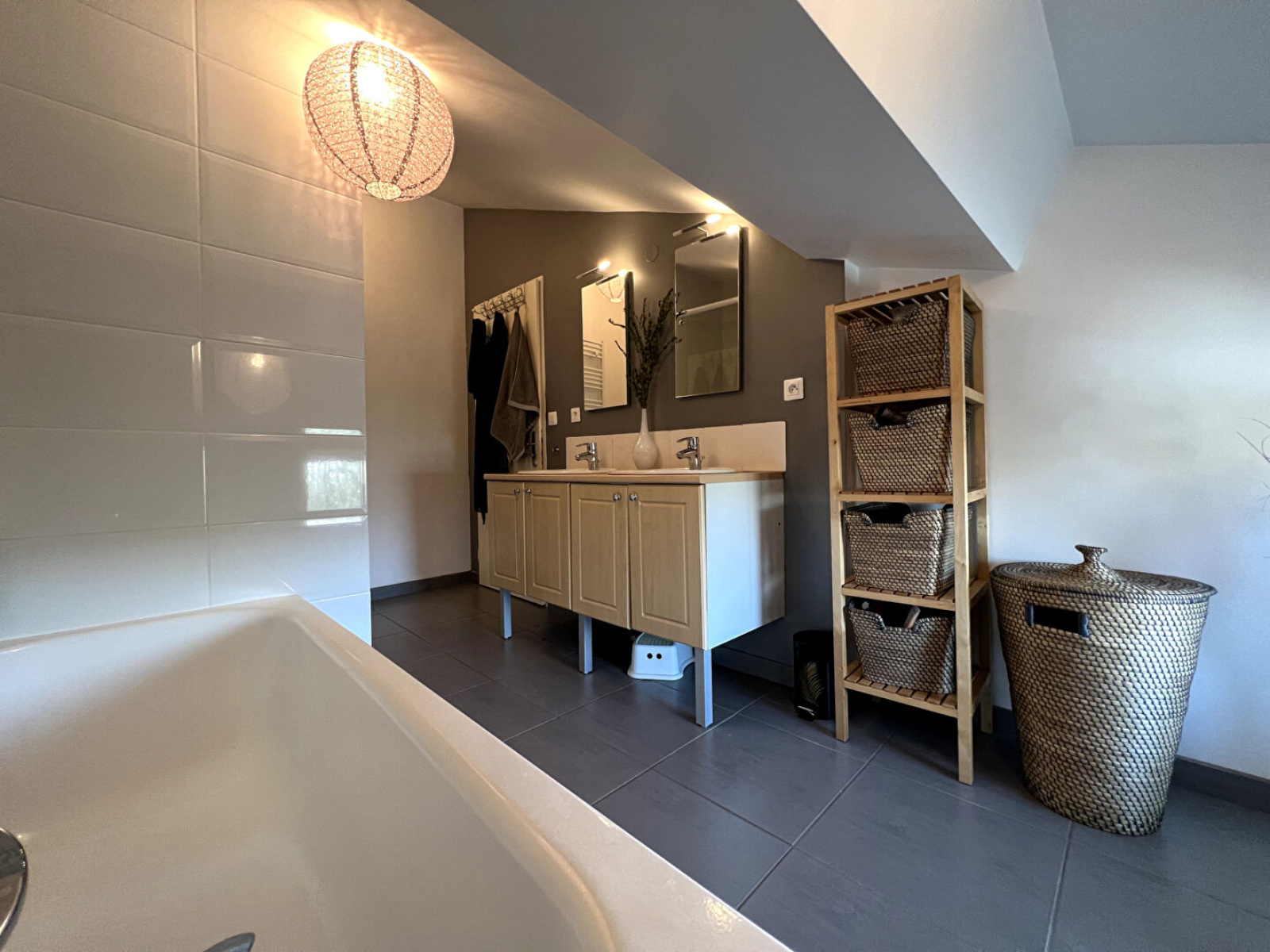 En exclusivité Dans cette belle bâtisse en pisé originellement de 1928 puis entièrement rénovée en 2013, Kate Brown vous présente cette superbe maison de 159,38 m² au sol ( 136,36 m² carrez) sur une parcelle de 367 m² avec son beau jardin, avec la plus belle cave de Saugnieu, 2 stationnements privés et le grand garage de 30 m² en sus Vous recherchez votre maison de famille avec charme et caractère? La voici ! Toutes les infos au 06 32 90 30 94 ! De plain-pied, le superbe hall d'entrée de 15,53 m² dessert le RDC La cuisine dinatoire de 35 m² est superbe et spacieuse avec une ouverture direct sur le jardin sans vis-à-vis et avec sa nouvelle terrasse en pierre d'Egypte (en cours de création) et son beau jardin. La cuisine de 2013 est entièrement équipée en électroménagers et du mobilier Ikéa et elle est complété par des aménagements sur mesure Le séjour de 25 m² avec son sol en véritable carreaux de ciment d'époque vous sublimera ! Avec sa cheminée et son véritable plafond traditionnel vous ne pourrez que être séduit ! La buanderie-cellier 4,62 m² offre un emplacement de stockage et la buanderie Les toilettes du rdc de 1,60 m² sont séparés avec lave-mains A l'étage, le véritable parquet unit tous les espaces et le dégagement de 12 m² est agréable - un espace terrasse de 9,18 m² La chambre parentale de 21,64 m² est très belle et lumineuse avec la possibilité d'aménager un espace dressing conséquent. Elle bénéficie de sa salle d'eau privative de 2,67 m² avec une douche et une vasque avec rangements La 2ème chambre de 10 ,27 m² avec son Velux et son aménagement de placard mural possible La 3ème chambre de 18,69 m² (de 7,73 m²) est agrandie par son espace sous toit et permet de nombreux rangements La véritable salle de bain de 9,82m² offre la douche, la baignoire, les deux vasques, les toilettes et du rangements Un espace dressing de 2,58 m² a été aménagé sous les toits Le garage non-attenant de 34,74 m² offre une hauteur sous plafond très agréable permettant l'aménagement d'une grande mezzanine - idéal artisan ou bricoleur ! L'accès se fait par la grande cour commune aux 3 lots avec portail commun La cave en pierre voutée de 11,27 m² est tout simplement exceptionnelle 2 places de stationnement sont privatives devant la bâtisse A savoir : - en 2021 installation de la climatisation réversible Toshiba dans la cuisine et les 3 chambres - La bâtisse a été divisée en 3 lots avant 2012 avant la rénovation et donc nous sommes mitoyen d'un côté - Belle rénovation avec matériaux de qualité comme fenêtres Alu, volets roulants en Alu et porte d'entrée Alu - Chauffe-eau thermodynamique Atlantic - Radiateurs électriques Atlantic - Façade neuve de 2013 - Gouttières et chêneaux en zing - Assainissement neuf de 2013 rejoignant le réseau commun aux 3 lots - Taxe foncière de 1 194 euro - EDF 2300 euro pour une année (avant la clim) - Diag en cours le 22/03/2022 Toutes les informations au 06 32 90 30 94 A très vite, Kate