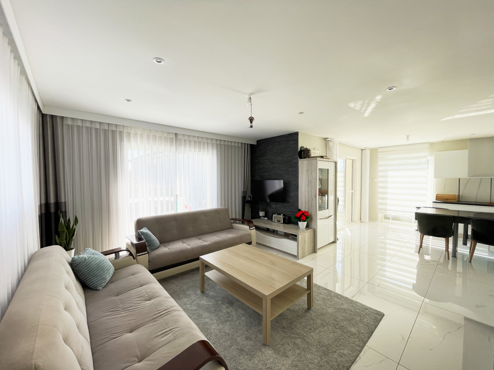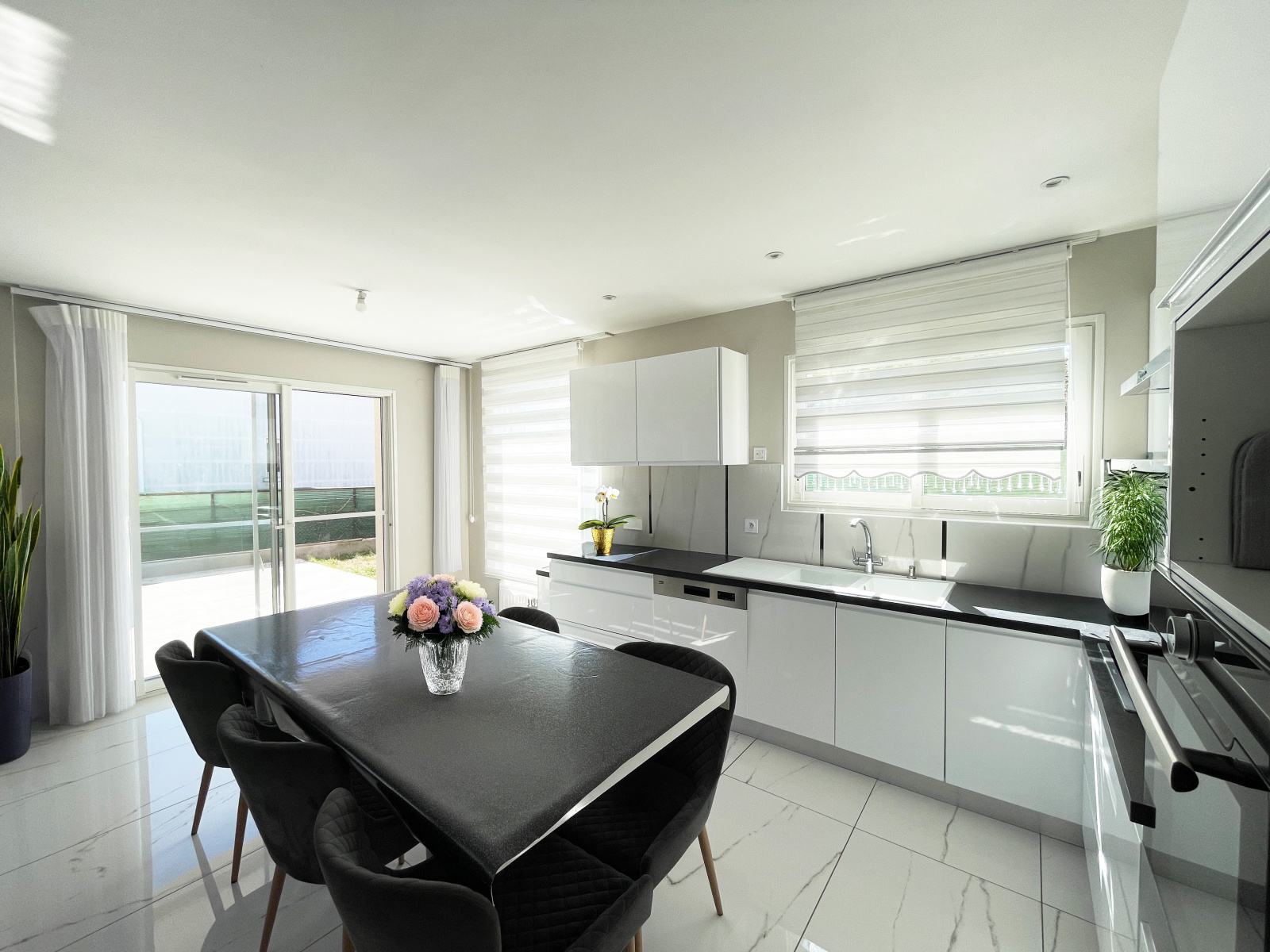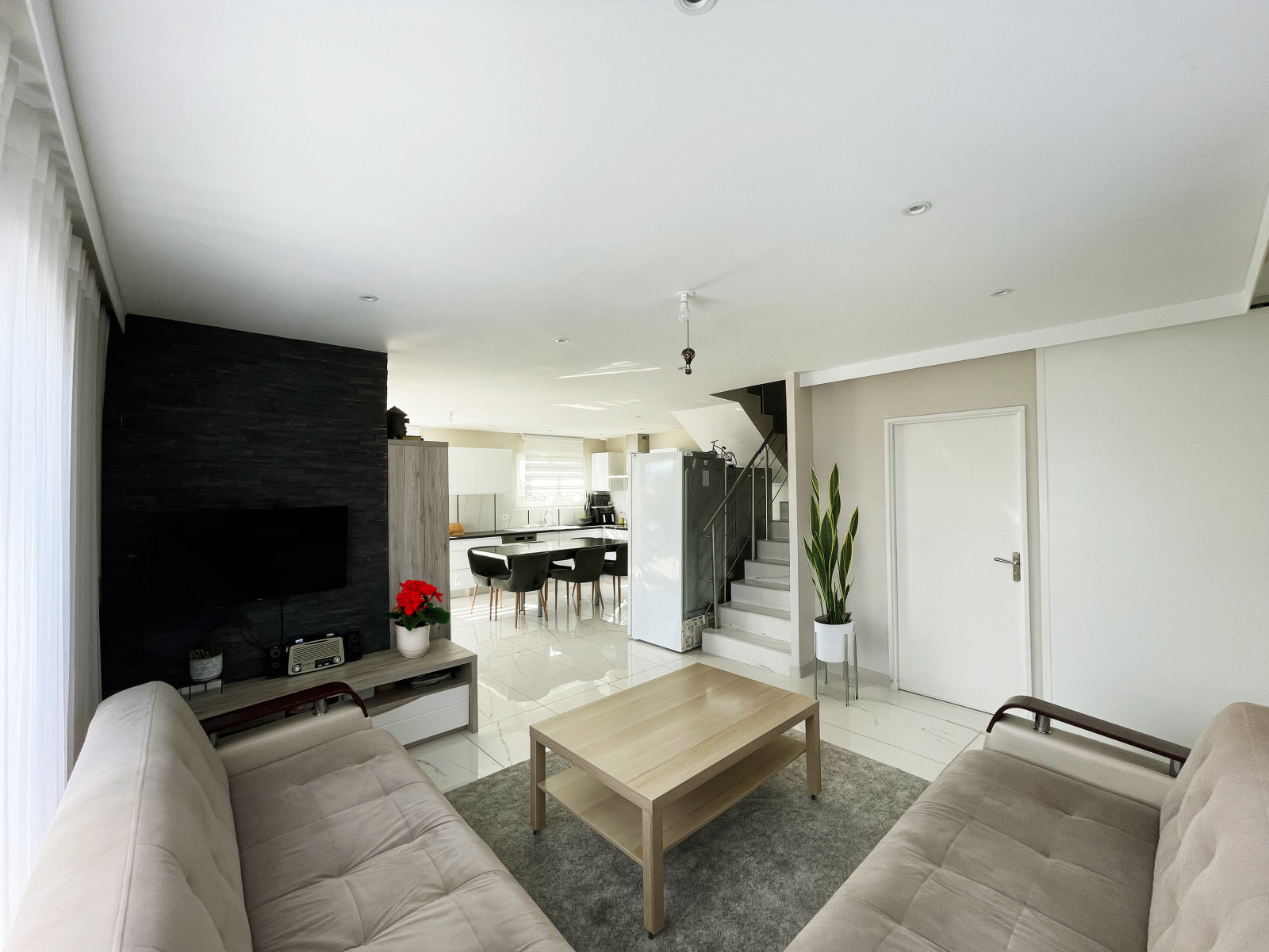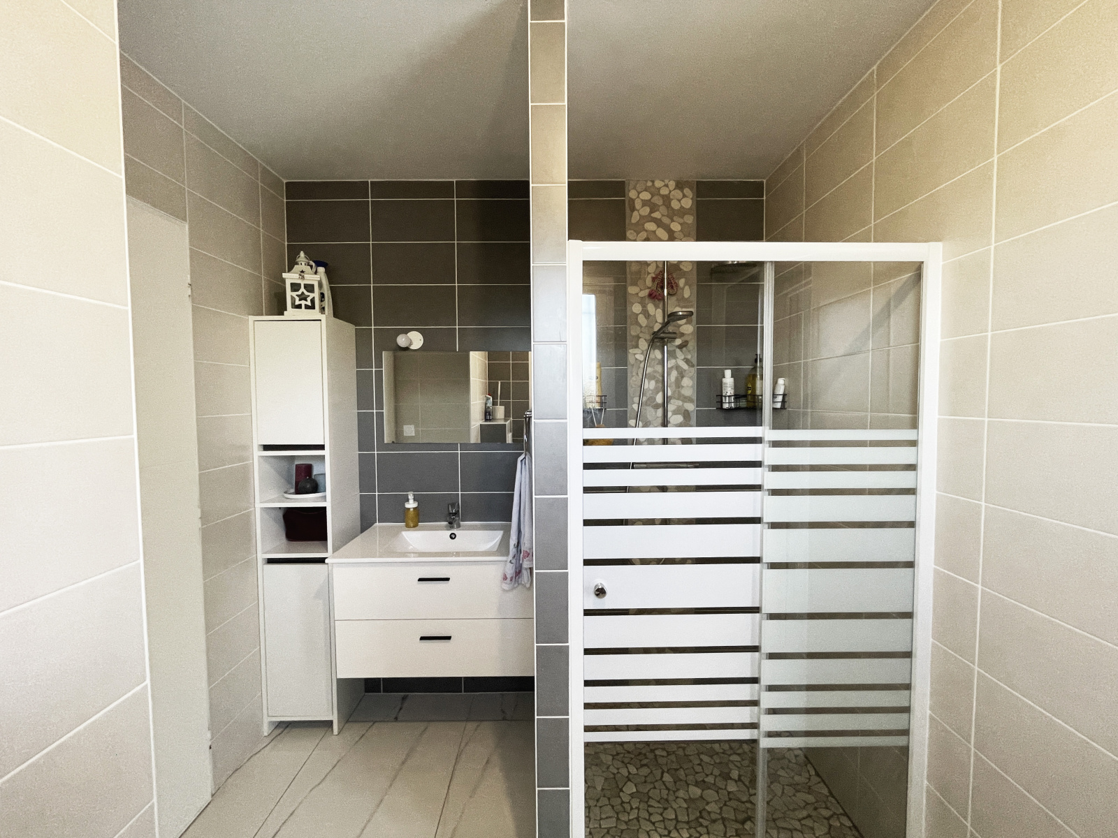 Au RDC, une lumineuse pièce à vivre de 40m2 avec cuisine américaine entièrement équipée ainsi qu'une grande buanderie/cellier, une suite parentale d'environ 25m2 avec un grand dressing et salle d'eau privative avec WC. Par la pièce à vivre, vous accèderez à une agréable terrasse carrelée de 20m2 donnant sur un petit jardin à aménager selon vos envies pour créer un espace cosy et agréable.
