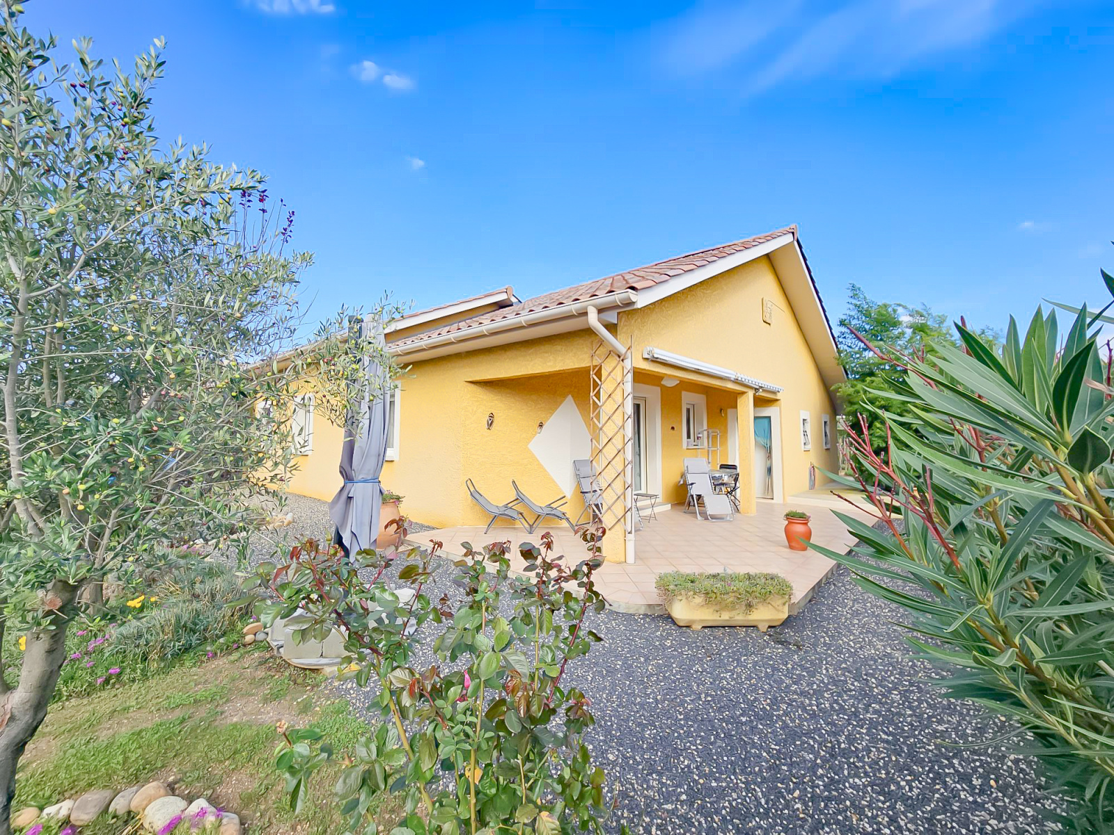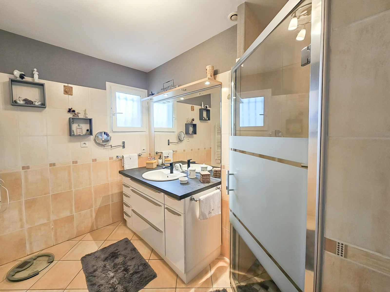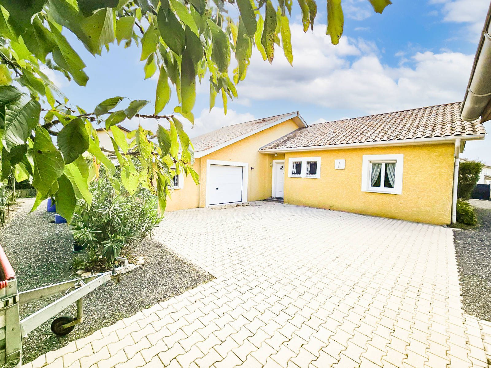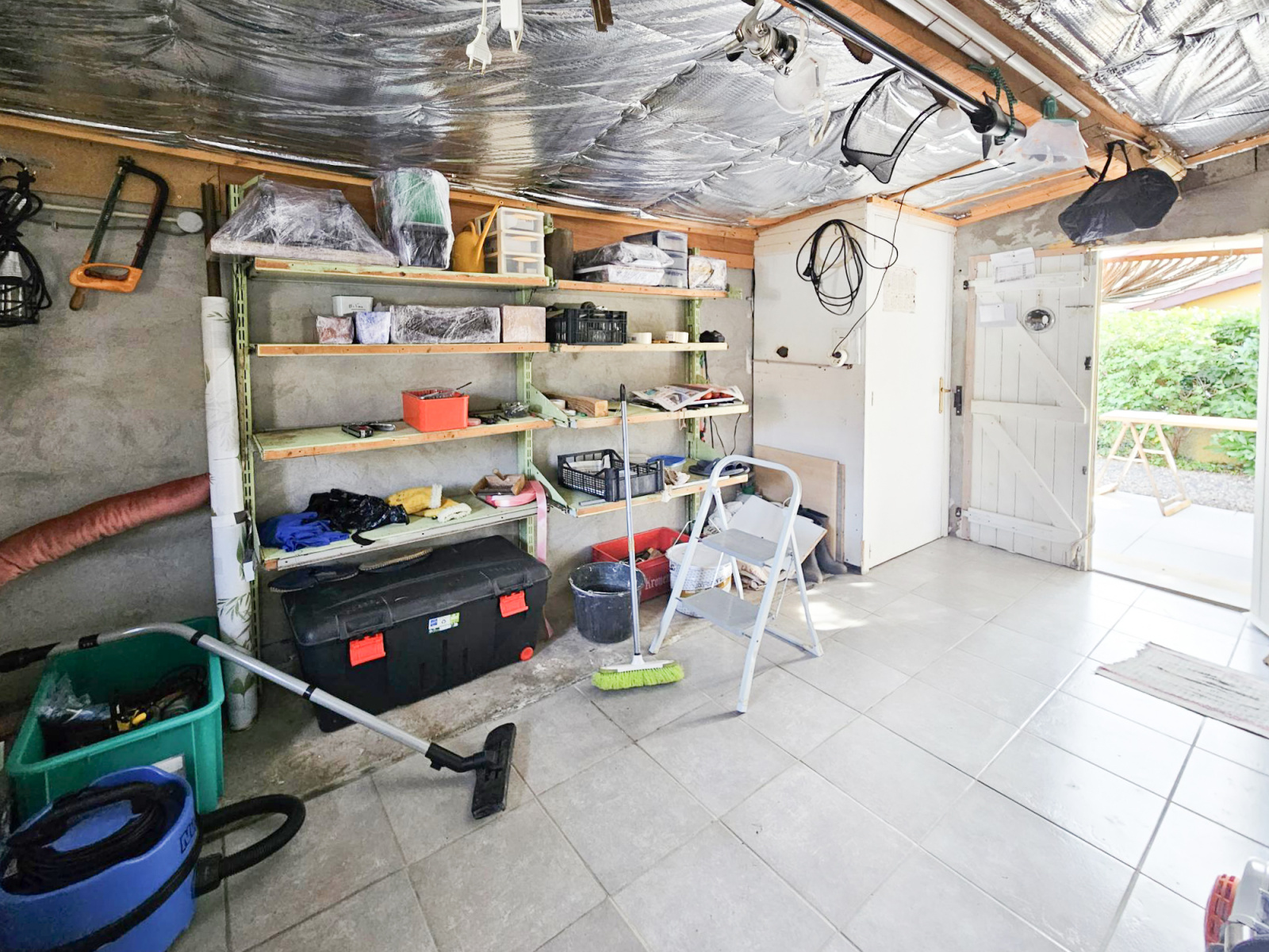 EN EXCLUSIVITE - Maison plain pied pleine de charme de 123m2 sur un terrain de 1027m2 arboré et joliment paysagé dans un quartier résidentiel recherché calme et agréable à vivre, dont un garage de 30 m2 carrelé et isolé avec buanderie + un atelier d'environ 12m2 et un abri voiture de 19m2 avec porte.