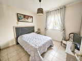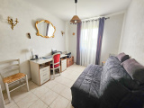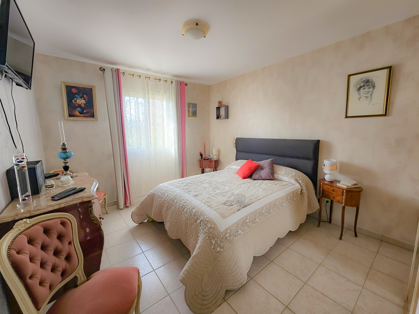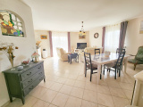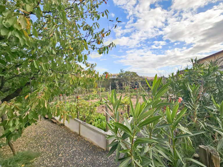 Grande baie vitrée s'ouvrant sur une terrasse d'environ 30m2 en partie abritée avec vue sur le jardin agrémenté de lauriers roses, de palmiers, d'olivier et de beaucoup d'autres variétés.
