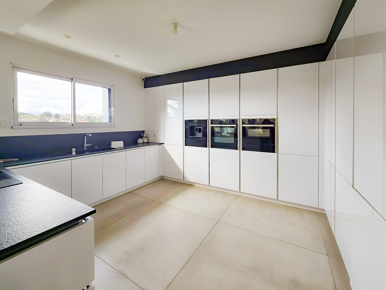 Une pièce à vivre de 103m2 avec de grandes baies vitrées avec volets BSO à lames orientables s'ouvrant sur une première terrasse de 60m2 profitant d'une vue exceptionnelle et des couchers de soleil époustouflants, une cuisine américaine entièrement équipée SCHMIDT avec plan de travail en granit du Zimbaboué.