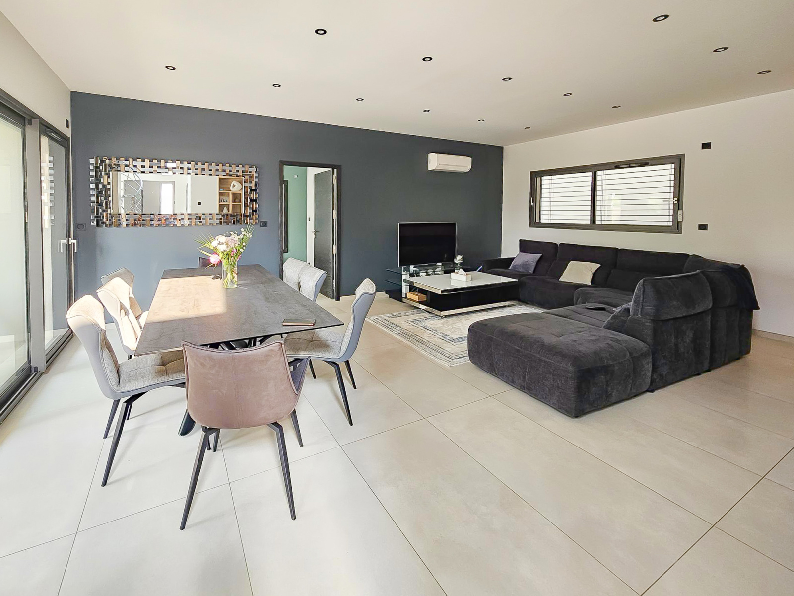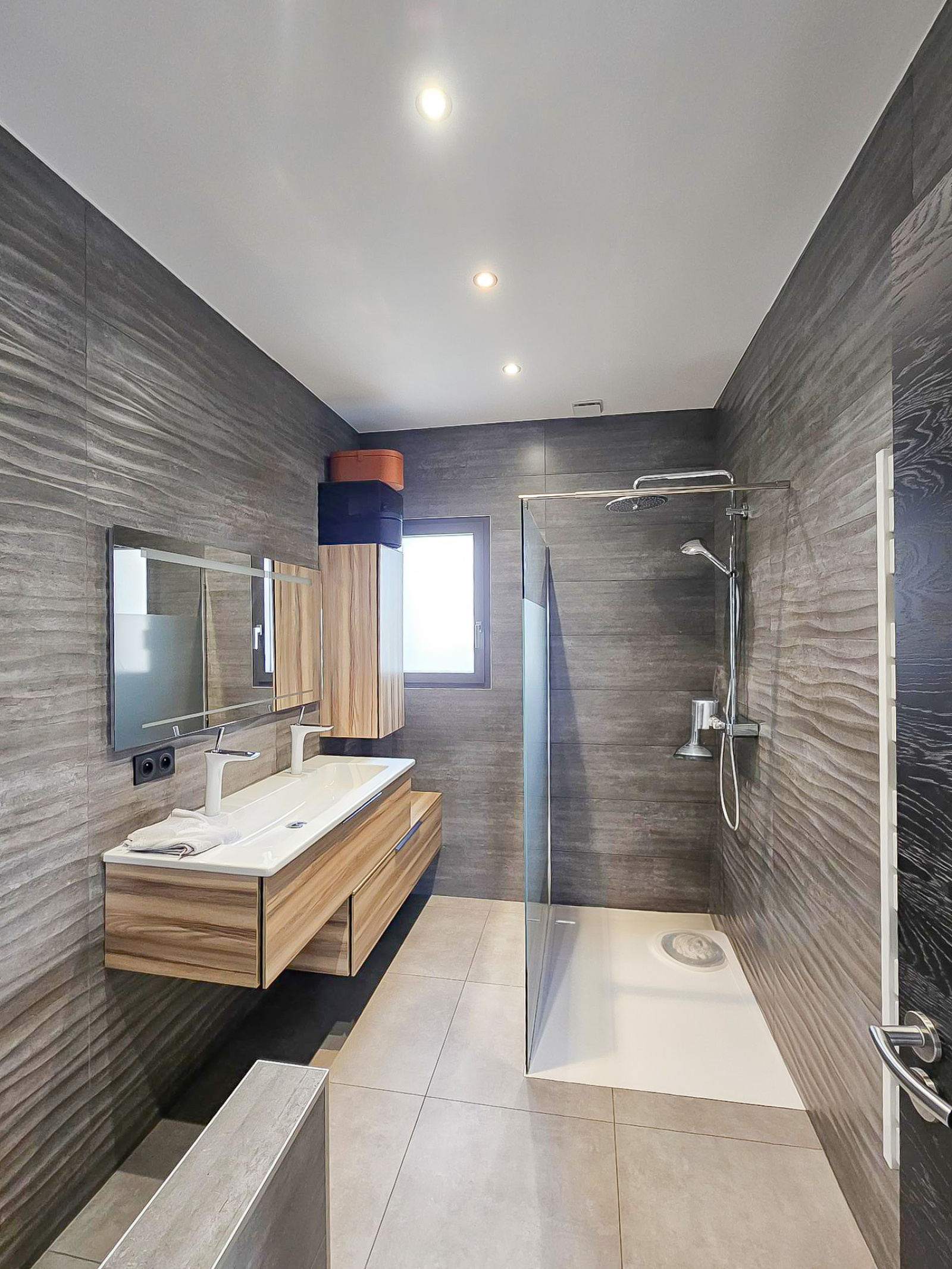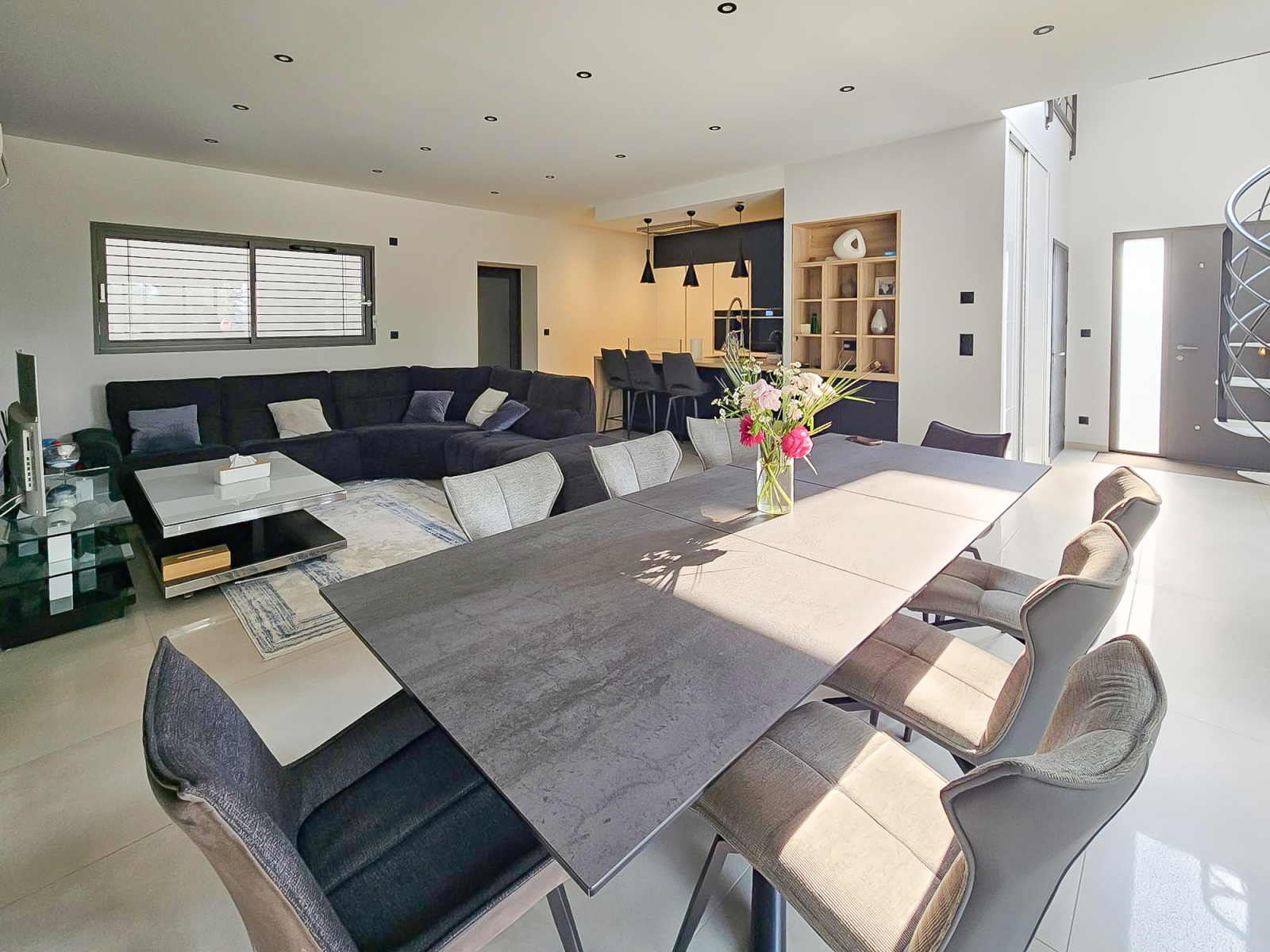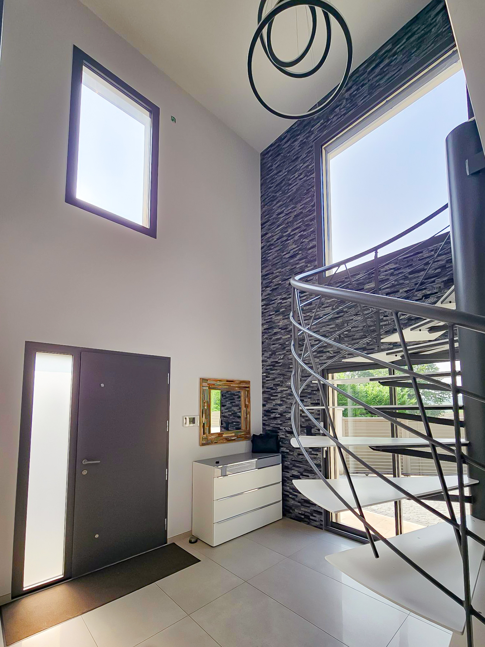 Elle offre une entrée majestueuse avec une belle hauteur de plafond, dressing, escalier style industriel élégant qui donne tout de suite l'ambiance des prestations de la maison.