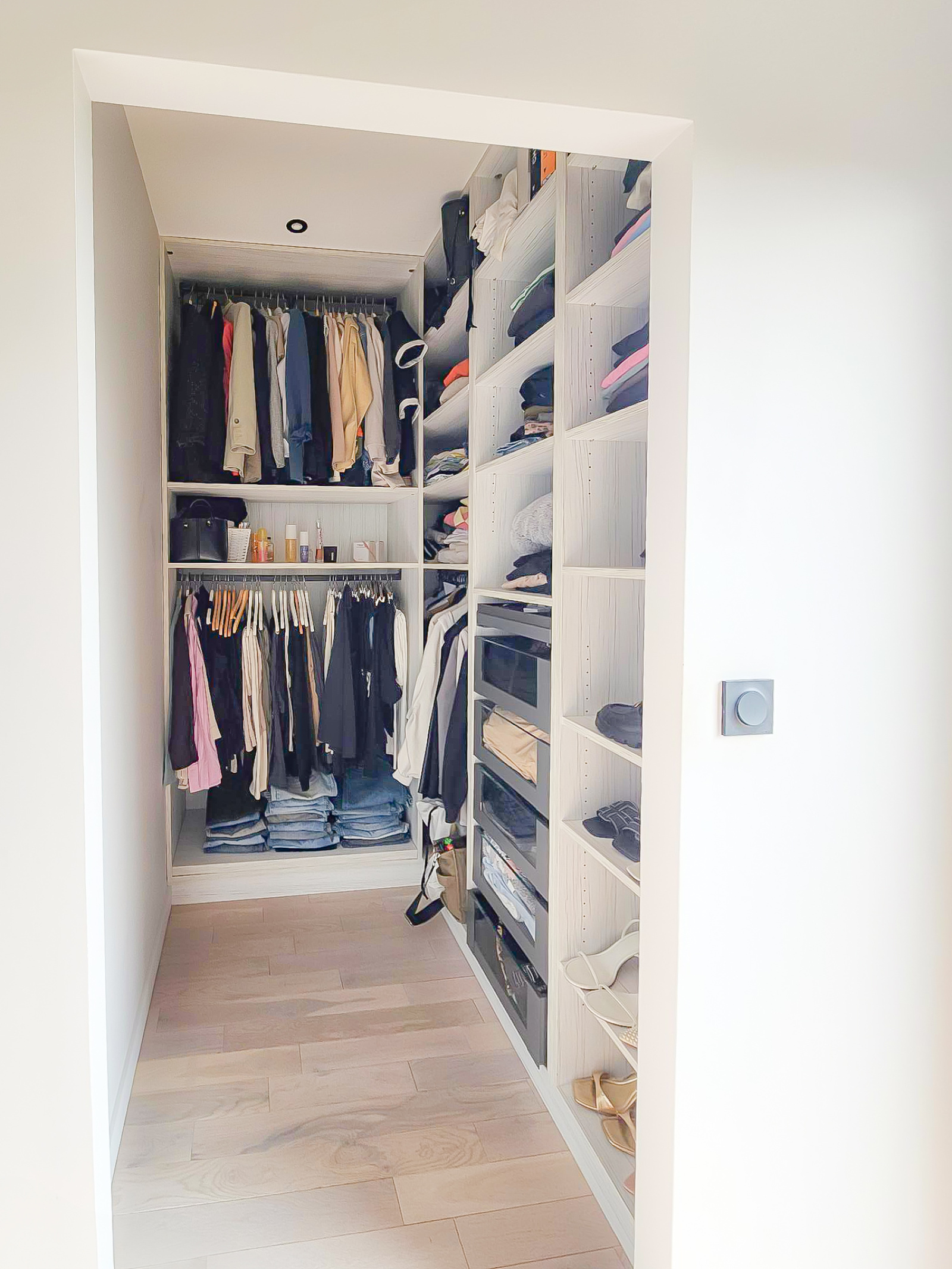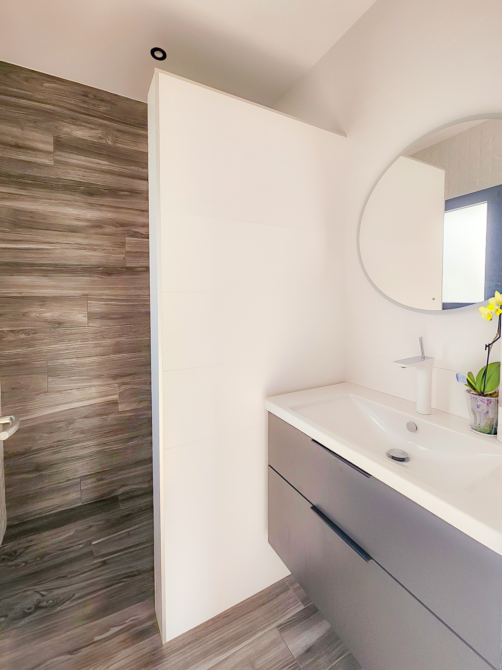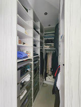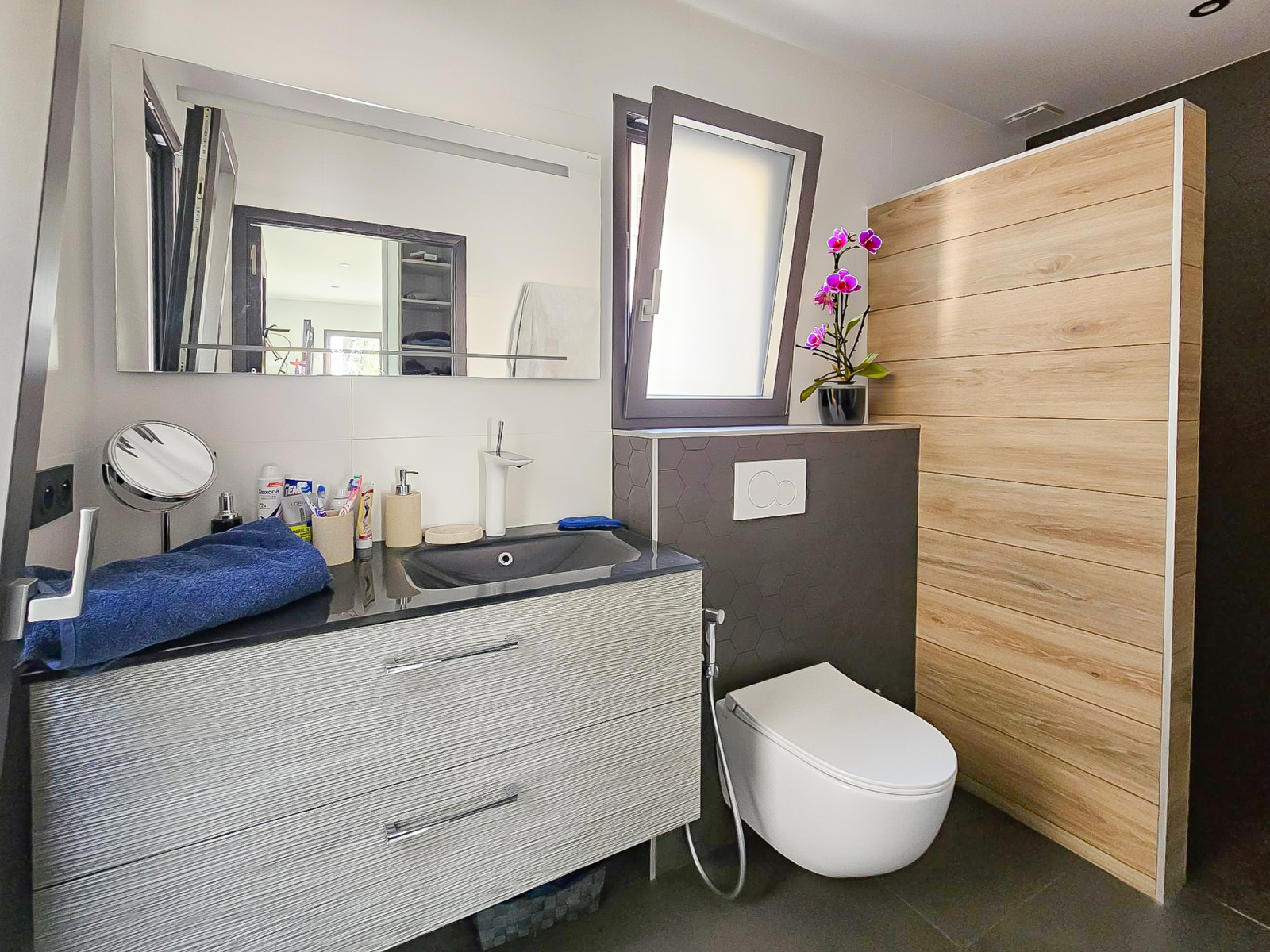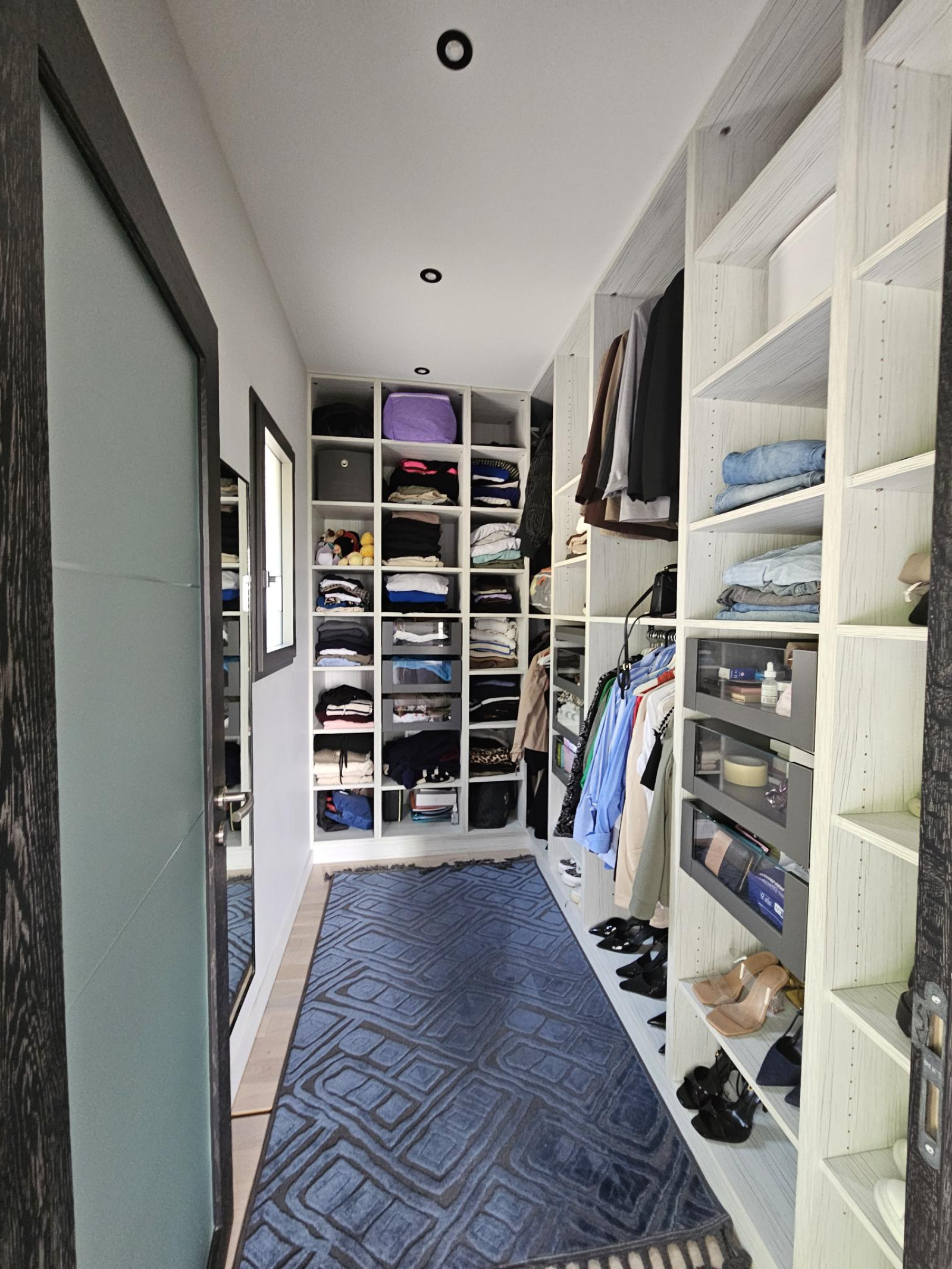 Elle offre une entrée majestueuse avec une belle hauteur de plafond, dressing, escalier style industriel élégant qui donne tout de suite l'ambiance des prestations de la maison.