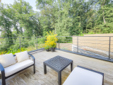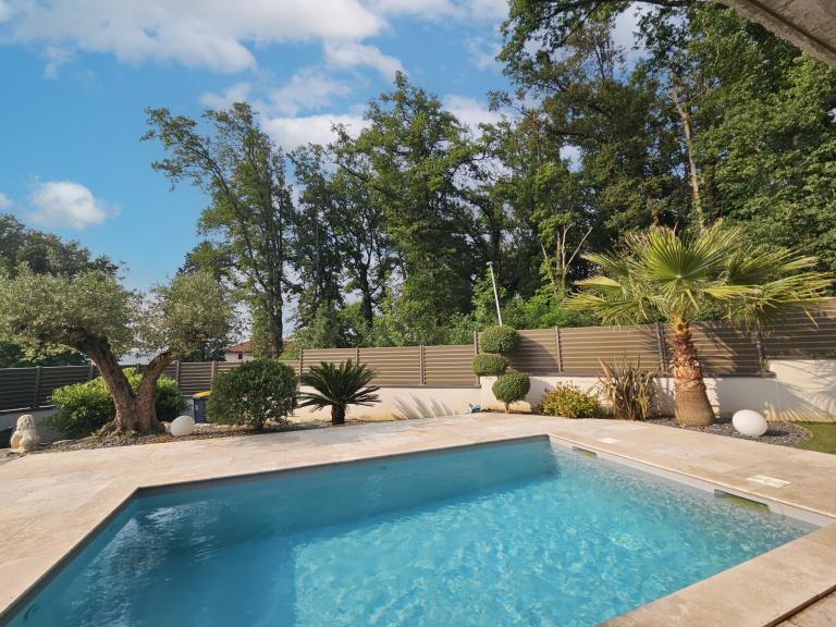 De grandes baies vitrées s'ouvrant sur une terrasse spacieuse avec vue sur la piscine et en fond, un écran de verdure avec vue panoramique sur de grands arbres.