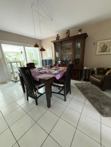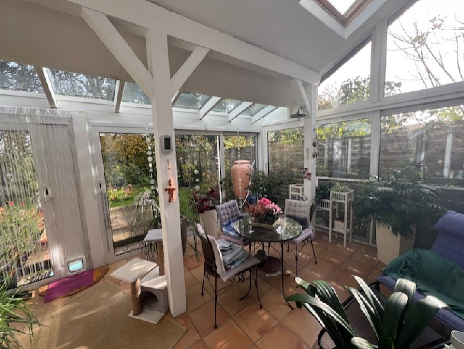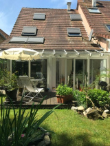 Maison accolée de 136,51 m² habitables, 156,68 m² au sol, séjour de 34,20 m² avec cheminée, cuisine équipée, salle d'eau avec WC, véranda de 18,70 m², terrasse et jardin d'env. 235 m².