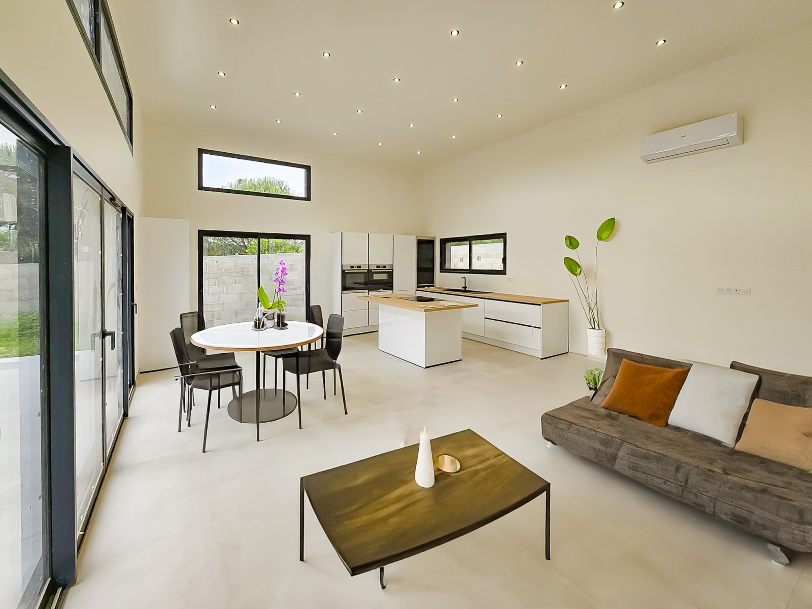 Une pièce à vivre lumineuse et agréable à vivre de 58m2 avec cuisine américaine entièrement équipée , dont une entrée légèrement en retrait, une grande baie vitrée s'ouvrant sur une terrasse carrelée de 80m2, aucun vis a vis et aucune nuisance.
