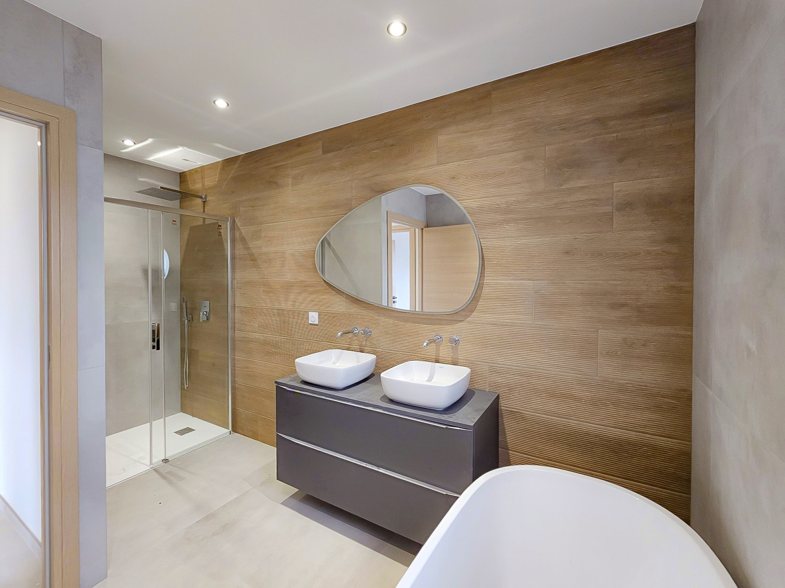 Une pièce à vivre lumineuse et agréable à vivre de 58m2 avec cuisine américaine entièrement équipée , dont une entrée légèrement en retrait, une grande baie vitrée s'ouvrant sur une terrasse carrelée de 80m2, aucun vis a vis et aucune nuisance.