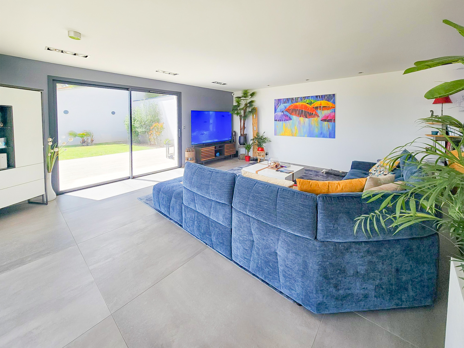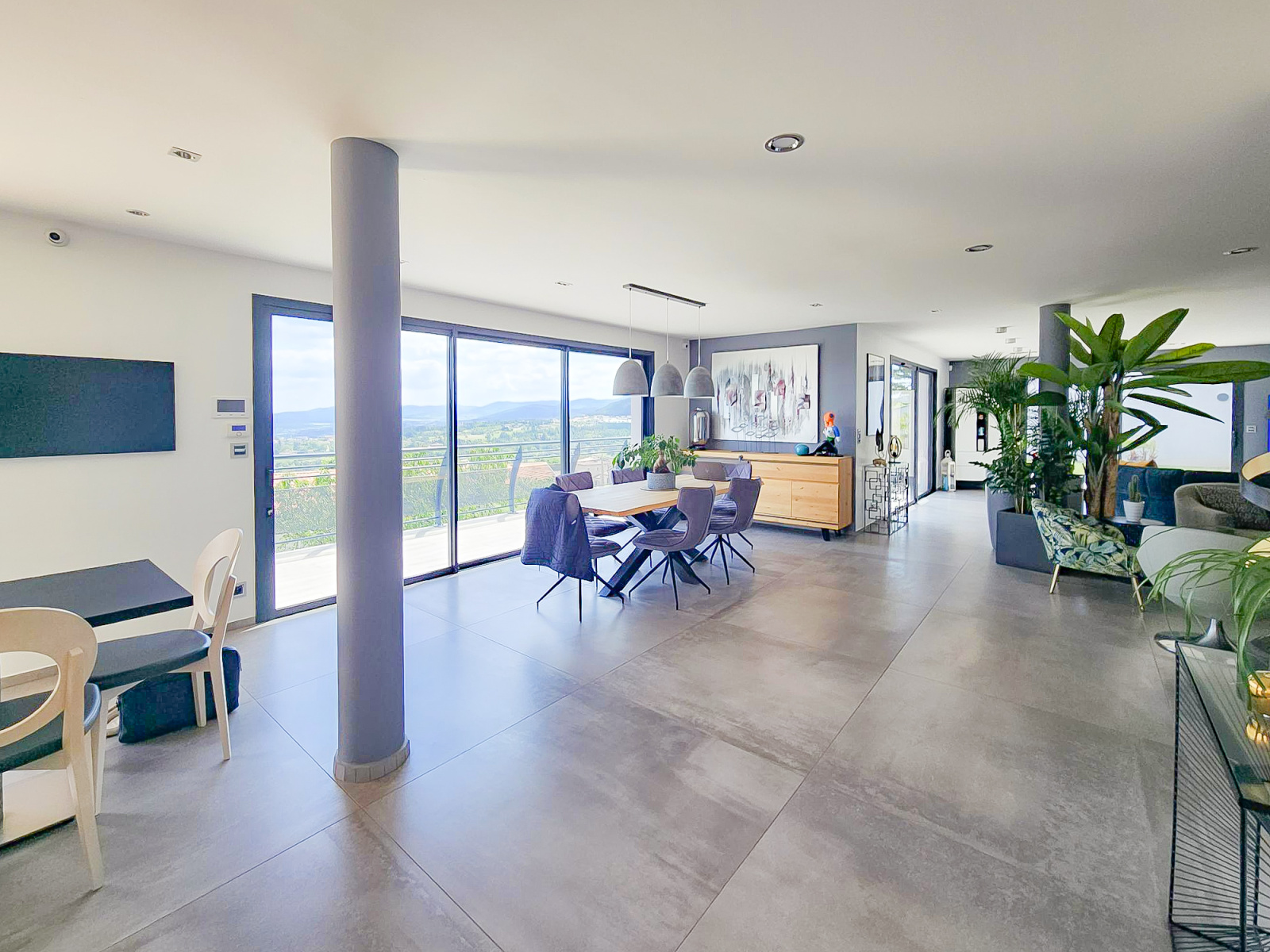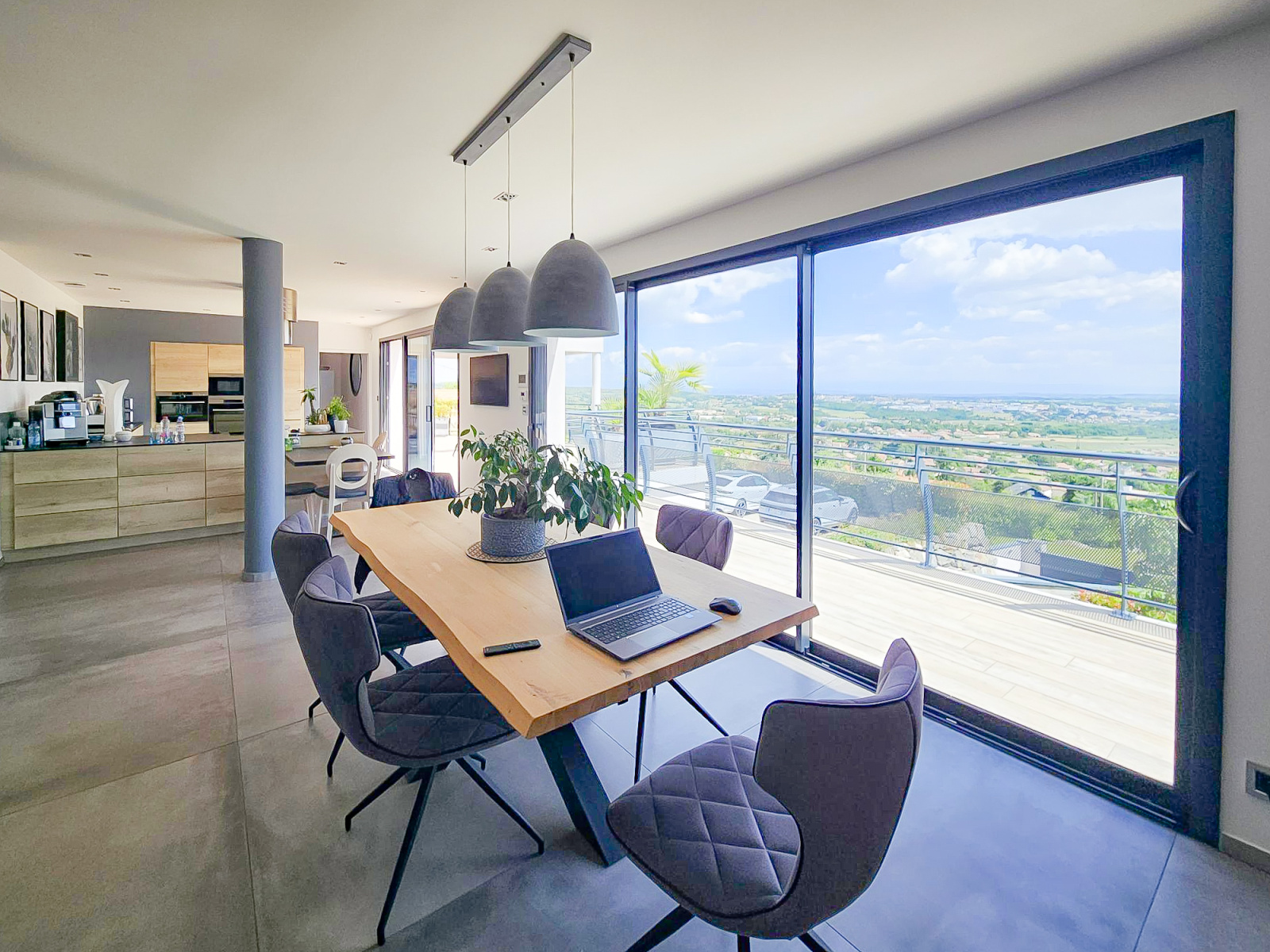 Elle offre une pièce à vivre de 100m2 avec espace salle à manger, cuisine américaine, un premier salon réception, un 2ème salon détente avec télé, de grandes baies vitrées où vous pourrez profiter de la vue de chaque pièce de la maison, plusieurs accès pour aller se détendre sur une terrasse aménagée d'environ 100m2 comme suspendue dans les airs qui donne un aspect à cette maison tel un bâteau de croisère !!!