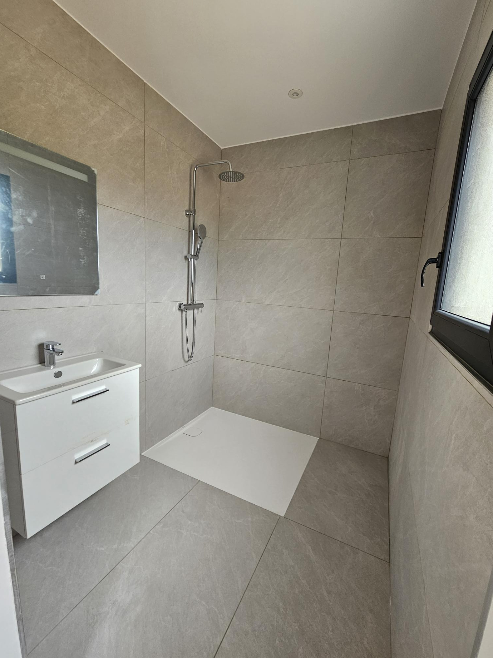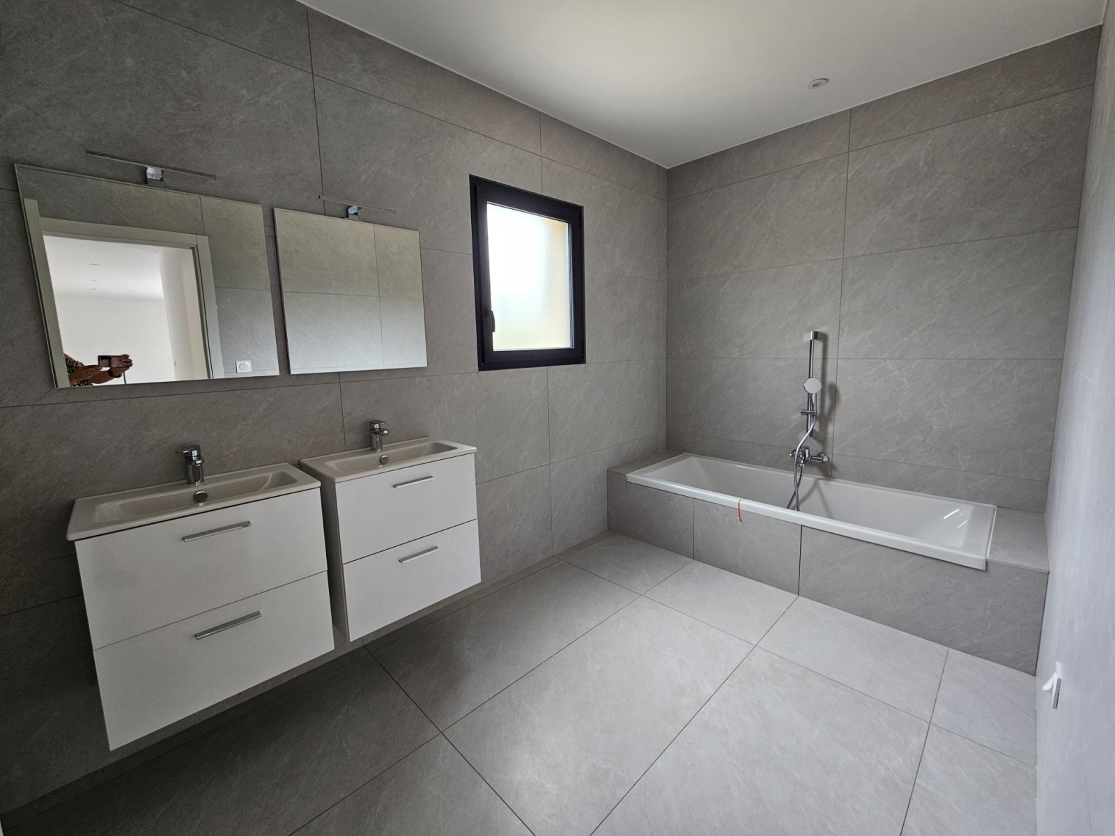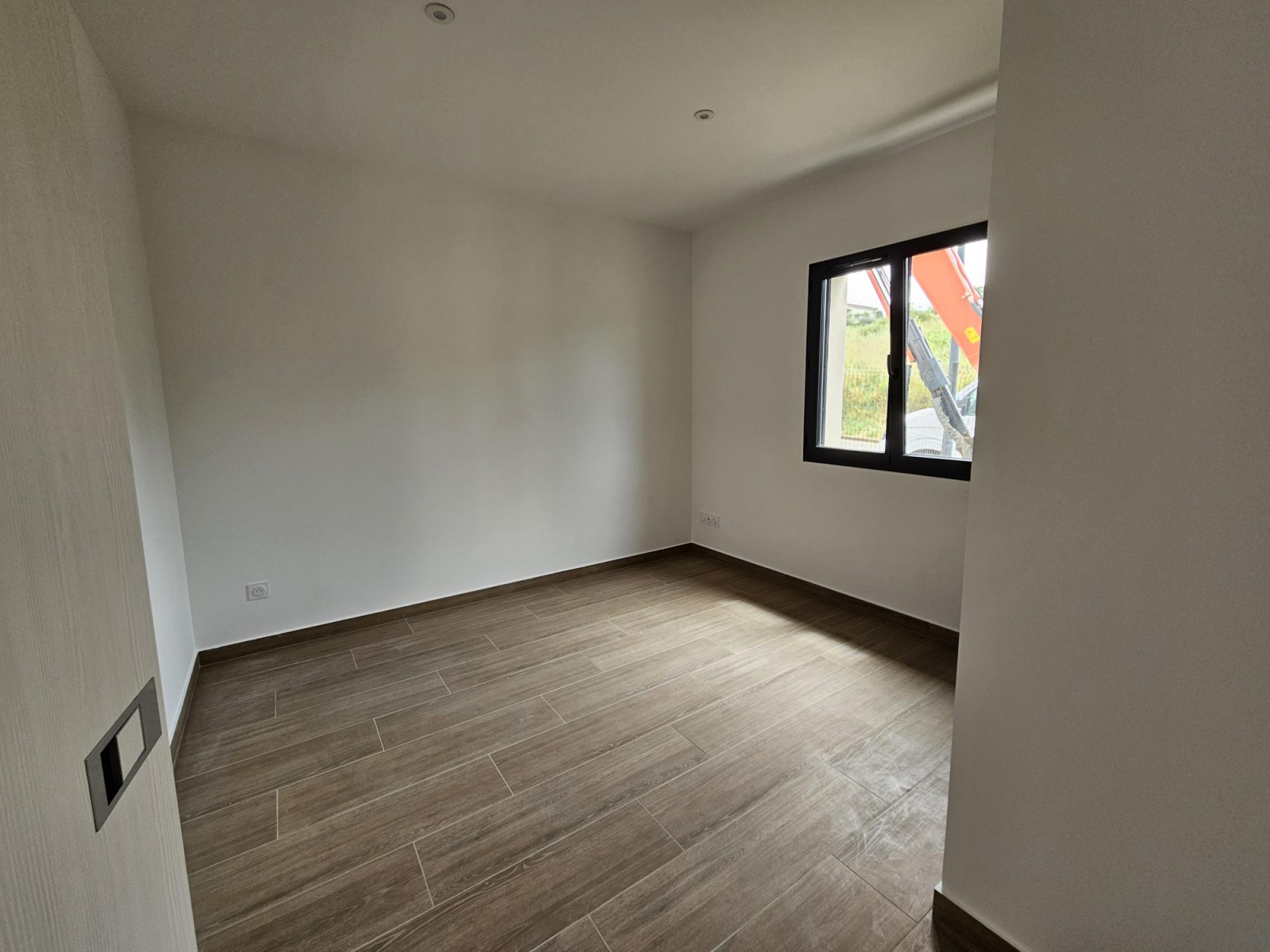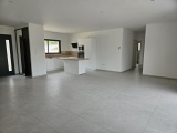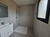 Maison construite sur vide-sanitaire de 1mètre, en brique, avec menuiseries blanches avec volets roulants électriques , carrelage 60X120, tuiles noires, chauffage gainable réversible (pour climatisation) avec pompe à chaleur, cumulus thermodynamique, terrain entièrement clos, chemin réalisé en baltazar compacté.