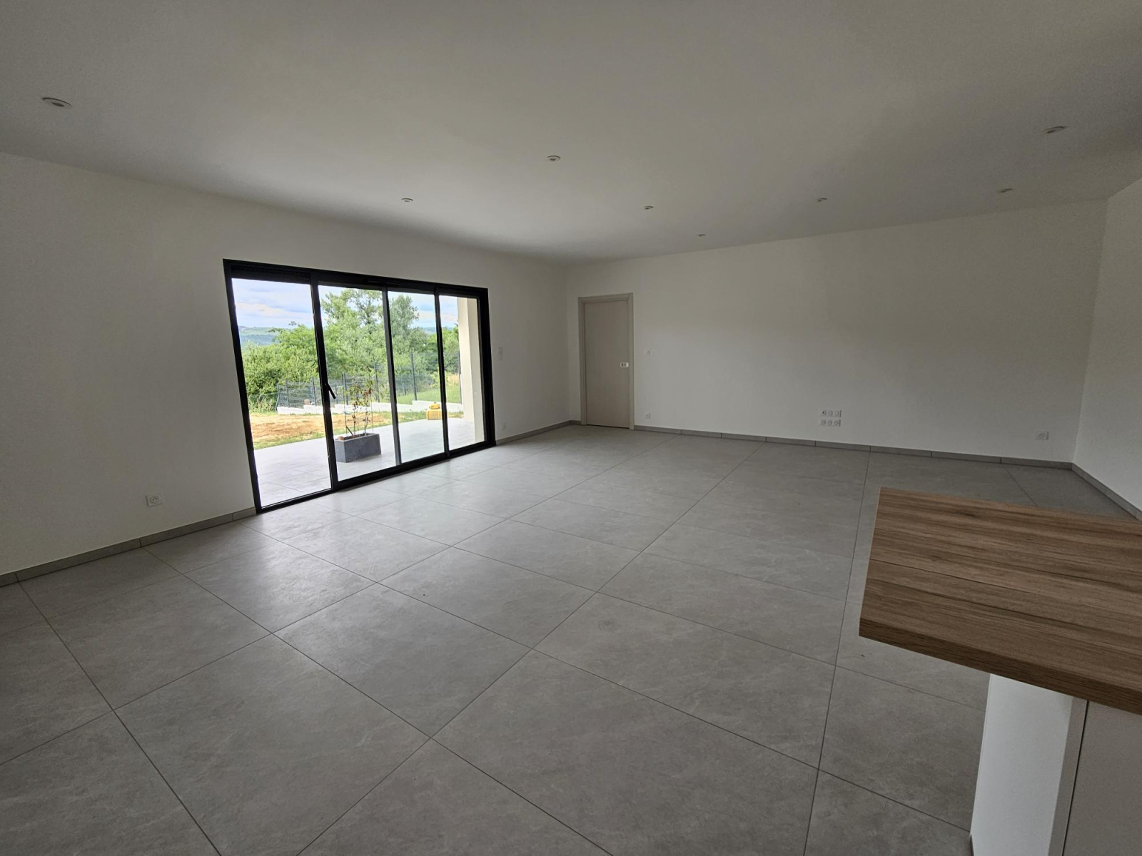 Une grande pièce à vivre de 45 m2 avec cuisine américaine équipée, grande baie vitrée s'ouvrant sur une terasse couverte.
