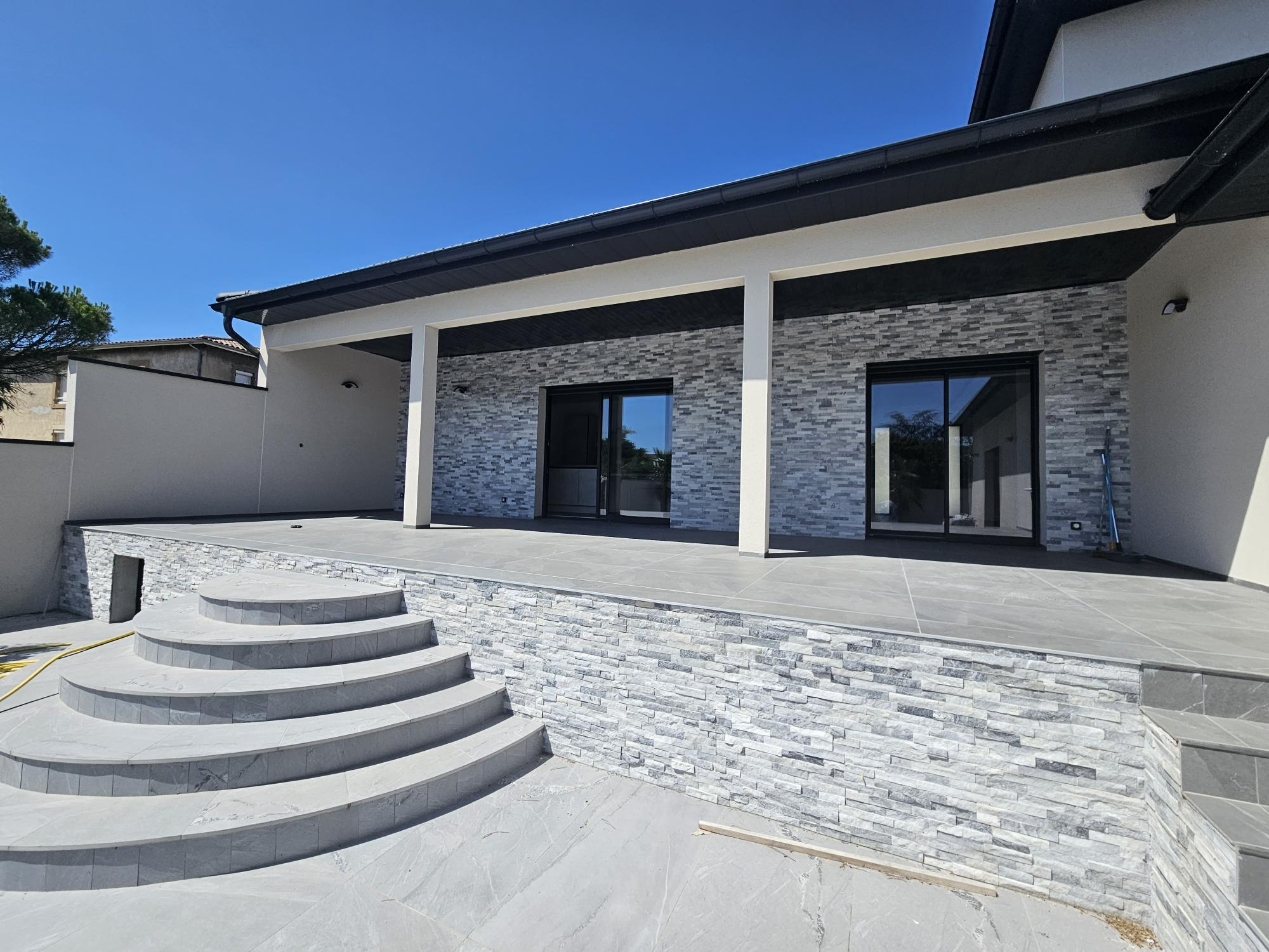 EN EXCLUSIVITE - Maison contemporaine plain pied, élégante et raffinée avec de beaux volumes et des prestations haut de gamme, de 160m2 + un garage carrelé et isolé de 31m2 sur un terrain entièrement paysagé de 673m2 agrémenté d'une piscine 6X3m avec volet de sécurité électrique.