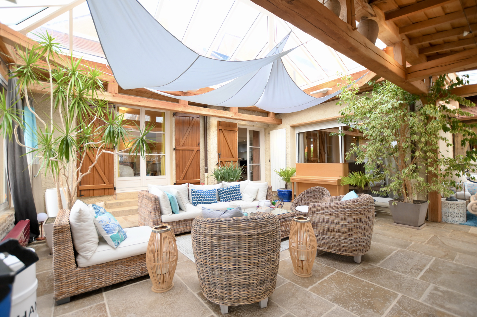 Une seconde bâtisse propose atelier, double garage et un appartement indépendant. Terrasse couverte, pergola bioclimatique et piscine complètent ce cadre de vie privilégié.