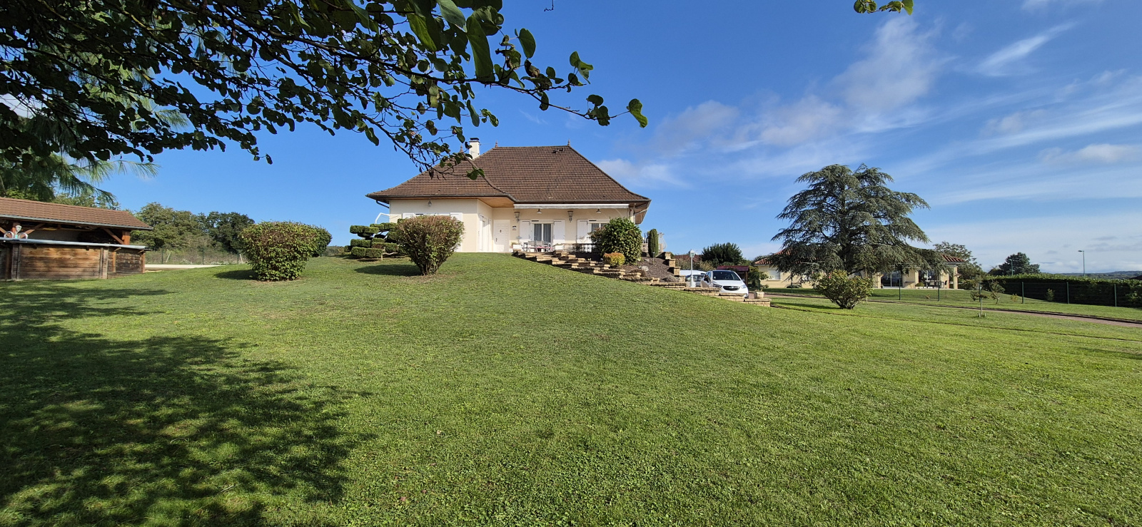 Le parc de la propriété est magnifiquement arboré, comprenant un abri de jardin de construction traditionnelle de 20 m², qui peut servir de terrasse couverte, attenant à un véritable jeu de boules et à un espace de jardin potager clos. L'entretien du gazon est entièrement géré par un robot, qui sera laissé avec le bien.