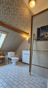 Au premier étage, un palier dessert deux chambres mansardées de 18 et 21 m², une salle d'eau avec toilette et un grenier de 25 m² (avec une hauteur sous plafond supérieure à 1,80 m), qui peut être exploité comme espace habitable.