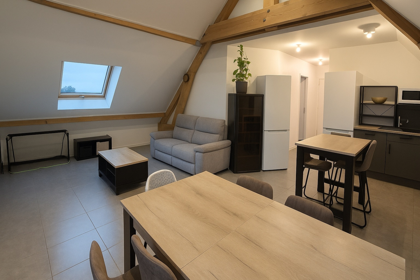 La pièce de vie, véritable coup de cœur de l’appartement, développe 40 m² au sol et (29 m2 carrez), offrant ainsi un espace convivial pour vos repas et moments de détente. Sa luminosité et ses volumes sous toiture en font un lieu chaleureux et accueillant.