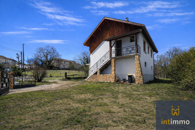 L’accès principal se fait par l’étage. On y trouve une entrée, un salon/séjour équipé d’une cheminée bois, une cuisine séparée à réaménager, deux chambres et une salle d’eau. Cet étage constitue aujourd’hui la partie habitable principale.