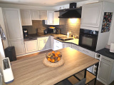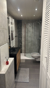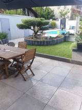 Elle se compose au RDC d'une belle entrée, d'une cuisine entiérement équipée avec coin repas et comptoir , d'un beau salon-séjour avec accès sur un magnifique exterieur entièrement paysagé, d'une salle d'eau avec douche à l'italienne, vasque, WC et placards équipés.