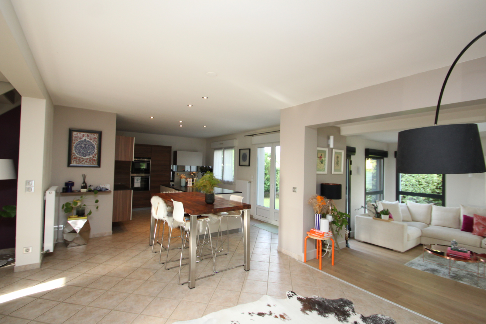 Édifiée en 1998, cette demeure allie volumes généreux et prestations soignées. Dès l’entrée, vous serez séduit par sa magnifique cuisine entièrement équipée, ouverte sur un vaste espace de vie de 55 m² baigné de lumière grâce à ses grandes baies vitrées donnant un accès direct à la terrasse et au jardin.