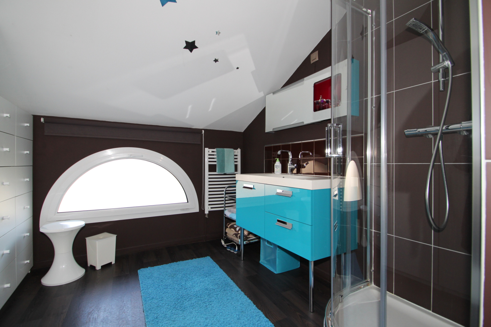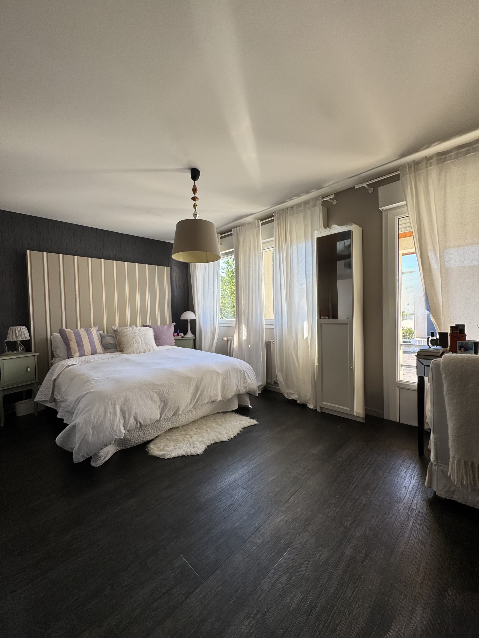 À l’étage, l’espace nuit se compose de quatre grandes chambres, dont une suite junior avec salle d’eau privative. La chambre parentale offre un véritable confort avec climatisation et grand dressing aménagé. La salle de bains familiale propose à la fois baignoire et douche. Un WC indépendant est présent à chaque étage pour plus de praticité.