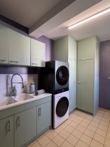 Un cellier-buanderie, idéalement placé entre le garage et la cuisine, complète la fonctionnalité de cette maison.