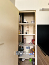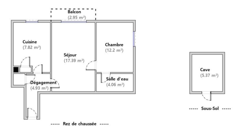 D'une vaste entrée de 4.93 m² distribuant placard 0.32 m², cuisine 7.82 m², placard 0.26 m², séjour 17.39 m², Chambre 12.2 m² et salle de bains avec WC de 4.06 m².