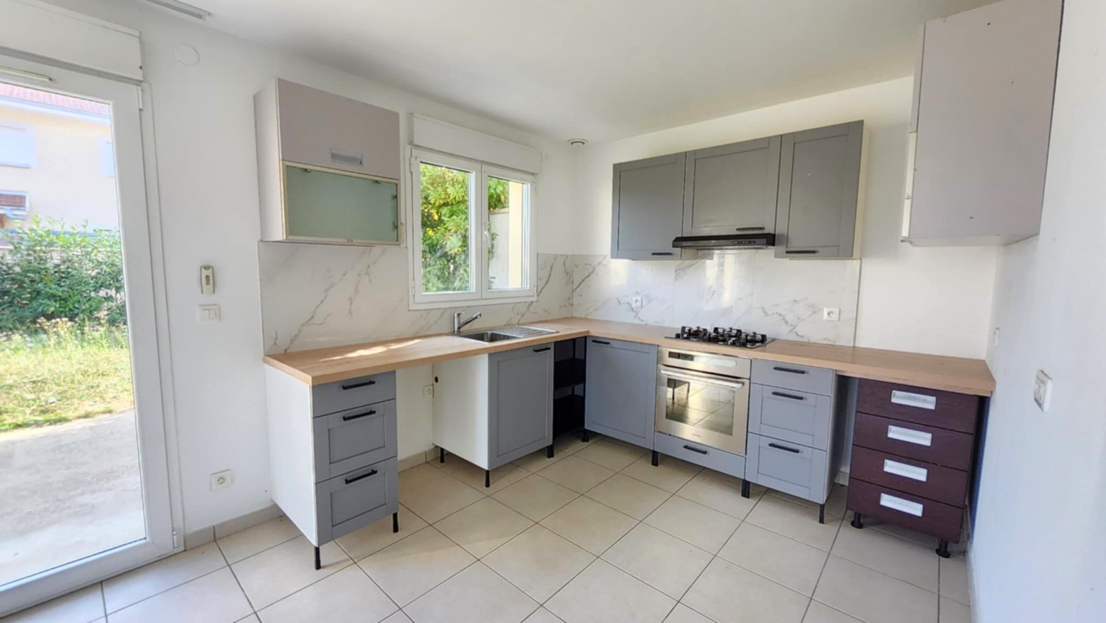 Ce bien vous offre 3 chambres, une grande salle de vie ouverte donnant sur la terrasse du jardin, 1 salle de bain avec baignoire, 1 salle d'eau avec douche, 2 garages.