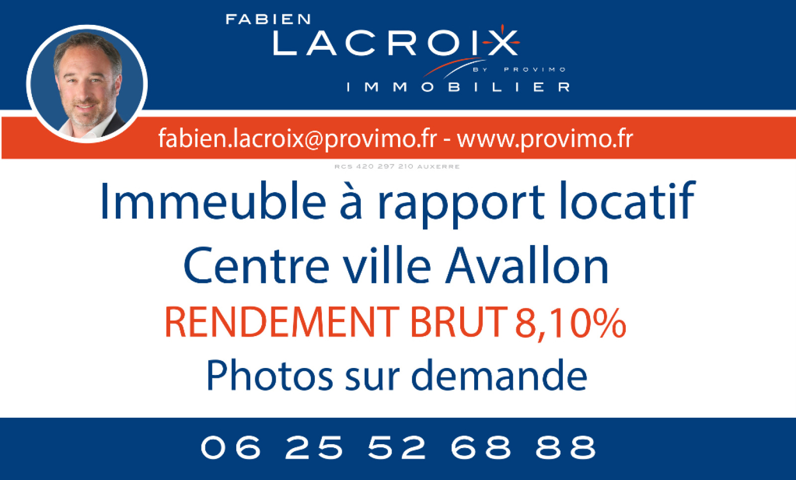 Immeuble au rapport. Situé en centre ville d'Avallon, cet ensemble immobilier comprenant Local commercial, un F2, Un F2 en duplex, un F3 en duplex et 4 caves et une courette. Le montant annuel des loyers s'élève à 25 990€/An. Aucun travaux de gros-oeuvre à prévoir. L'ensemble immobilier est très bien entretenu et tous les appartements sont occupés par des locataires sérieux. Pour plus de renseignements et un dossier photos, je suis à votre disposition.