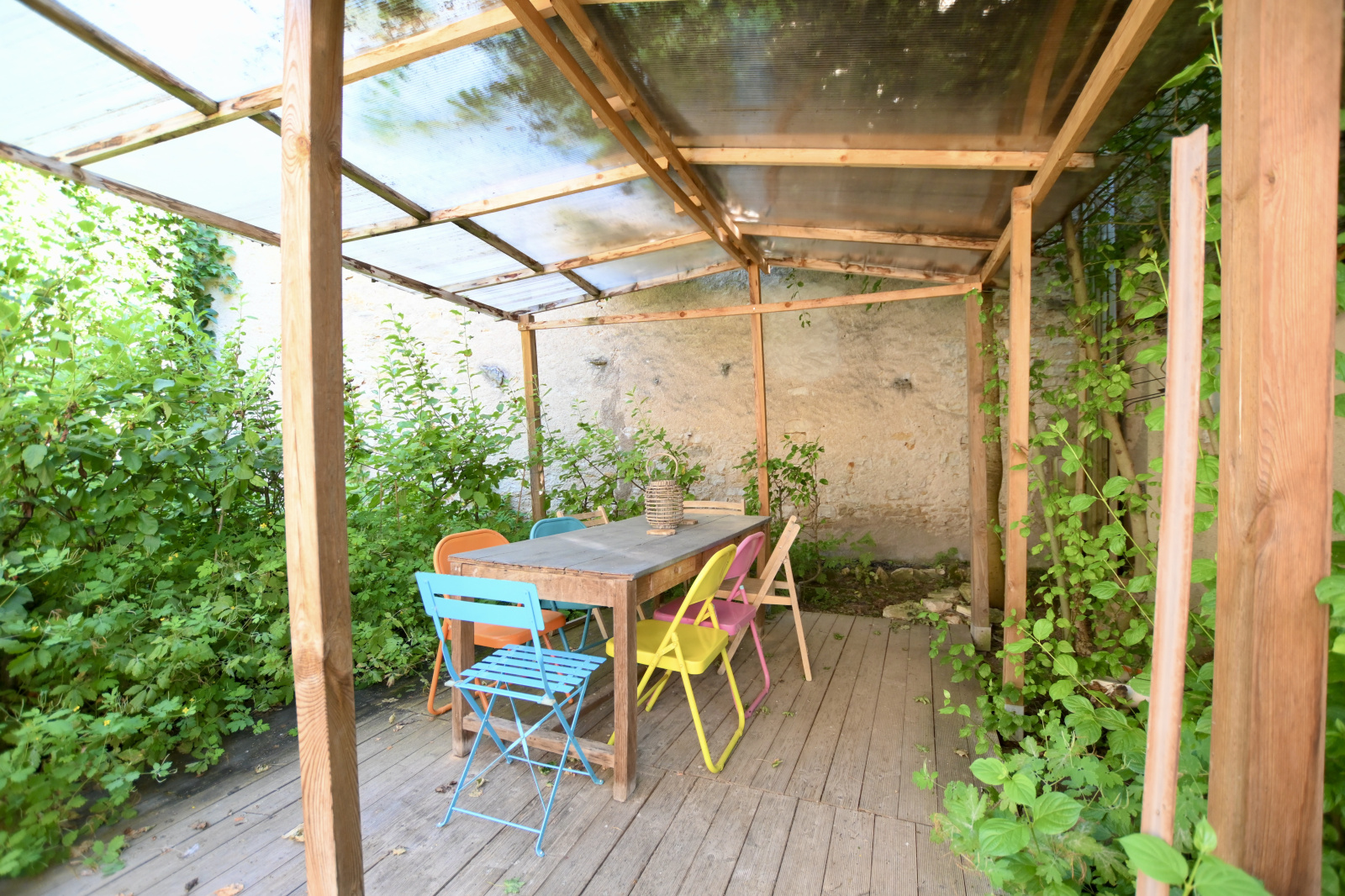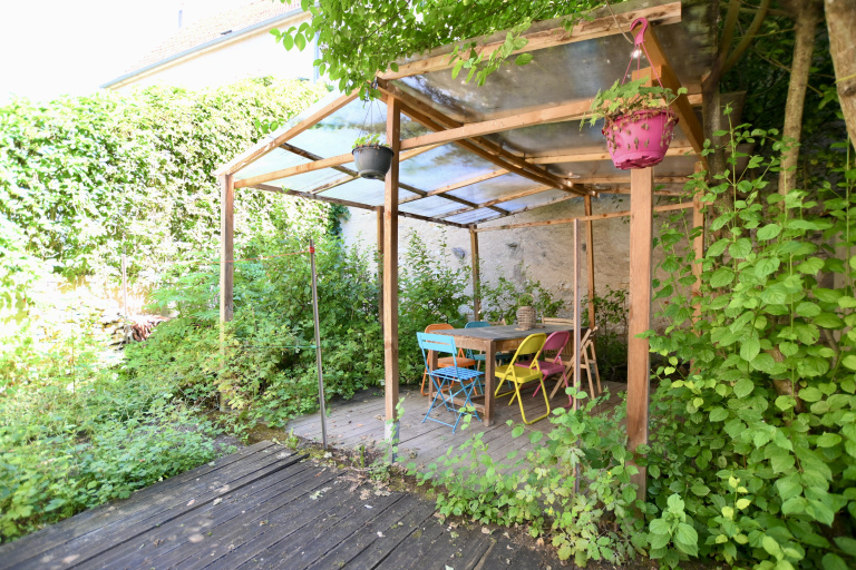 À l’extérieur, la vie s’organise autour d’un jardin accueillant, d’une terrasse propice aux moments de détente, et de cabanons pour le rangement ou les projets créatifs.
