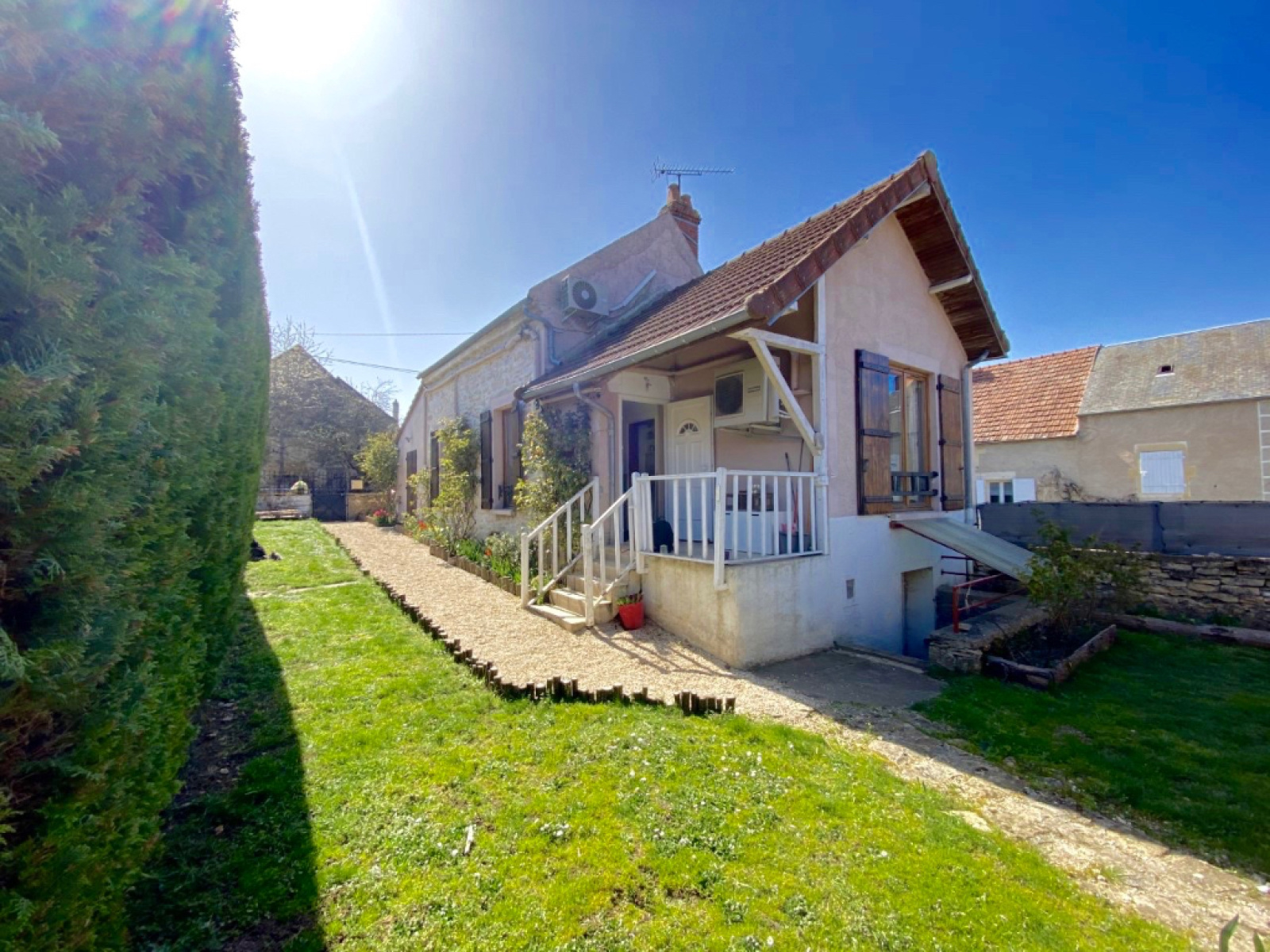 Dans le Vézelien charmante maison avec son terrain et un abri. L'habitation élevée en partie sur une cave comprend un patio, une entrée, une cuisine équipée dînatoire, une salle d'eau avec WC, un salon, une chambre avec grand placard, à l'étage une chambre mansardée avec son bureau. Le bien dispose de pompes à chaleur (clim réversible) et raccordé au tout à l'égout.