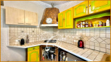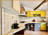 La pièce de vie, lumineuse et conviviale, est animée par une grande cheminée à foyer ouvert. La cuisine séparée, pratique, pourra facilement être repensée selon vos envies.