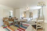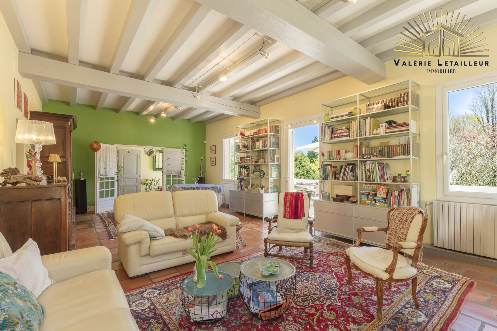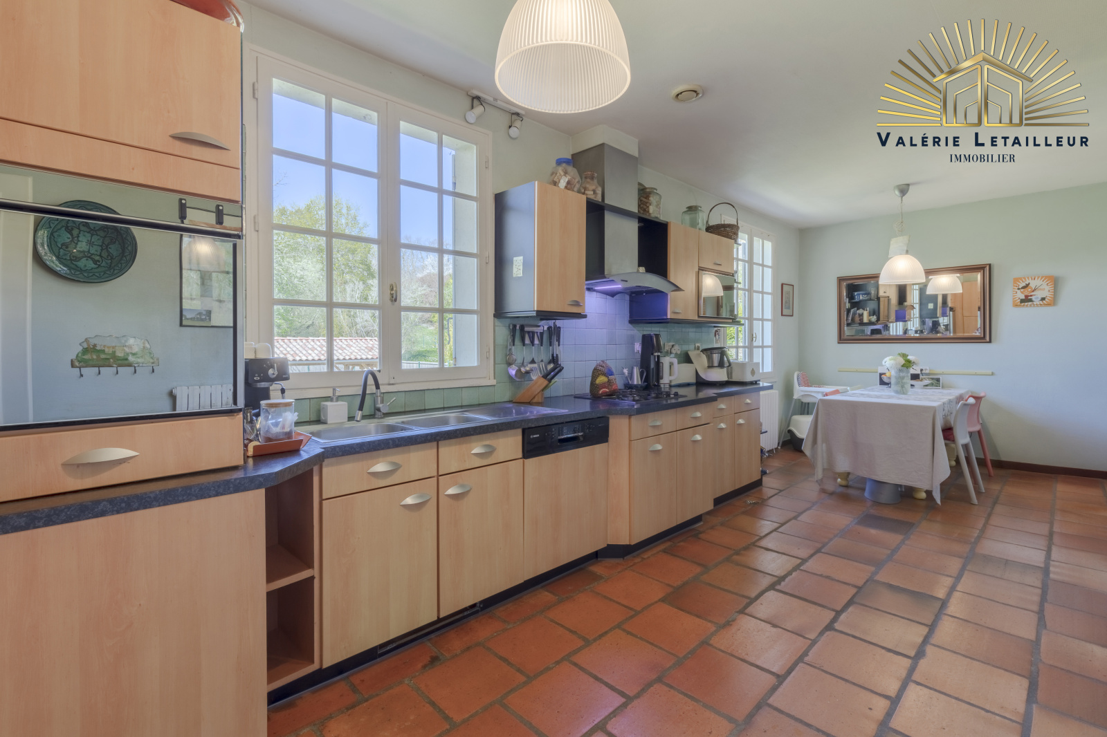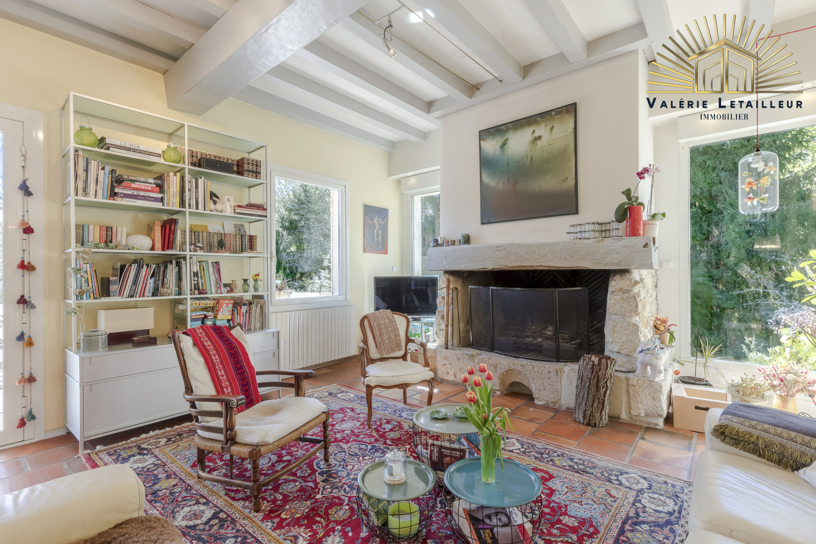 On découvre alors une entrée spacieuse qui ouvre sur une vaste pièce de vie baignée de lumière, agrémentée d’une cheminée ouverte. Depuis cet espace, on accède directement à un bureau ainsi qu’à une grande cuisine lumineuse, actuellement indépendante mais pouvant facilement être ouverte sur la pièce de vie pour créer un bel espace traversant.