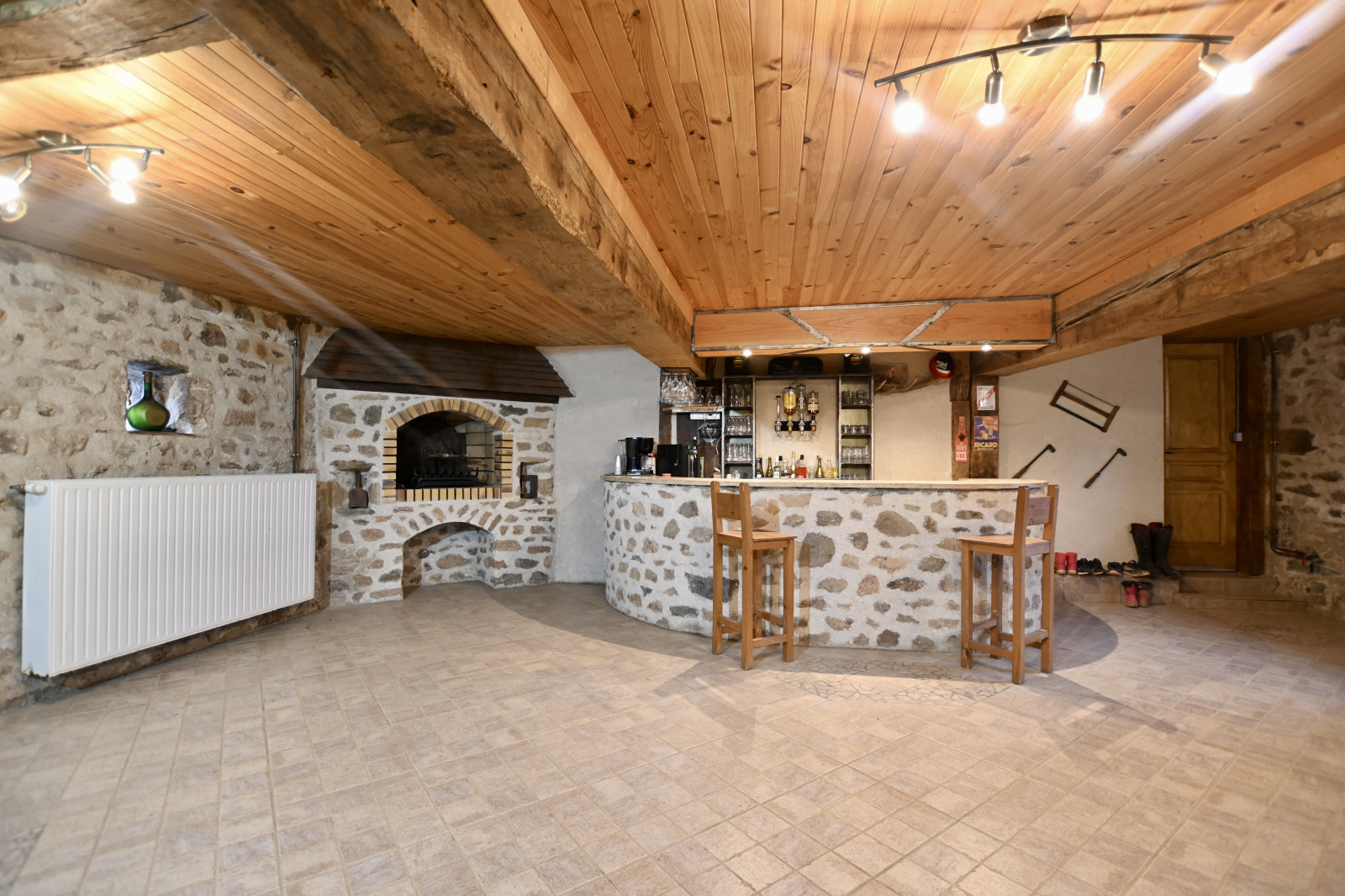 Dès l'entrée, le charme opère : le séjour chaleureux avec poêle à bois ouvre sur une cuisine américaine entièrement équipée. Un cellier, une chaufferie moderne avec ballon d'eau chaude thermodynamique et chaudière à granulés, un espace bureau, un salon cocooning, ainsi qu'une vaste pièce de réception avec bar et barbecue d'intérieur composent le rez-de-chaussée. Une salle de douche, un WC, une cave, un atelier avec évier et un grenier aménageable complètent cet espace fonctionnel.